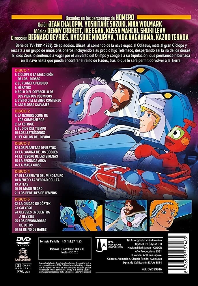 https://back.dvdstorespain.es/en/-60/92336-uchu-densetsu-ulysses-31-dvd--8436555537463.html92336Ulises 31 (5 discos) [DVD] (1981) Uchû densetsu Ulysses 31<p>Serie de TV (1981-1982). 26 episodios. Ulises, al comando de la nave espacial Odiseus, mata al gran Cíclope y rescata a un grupo de niños prisioneros incluyendo a su propio hijo Telémaco, despertando así la ira de los dioses. El dios Zeus lo sentencia a vagar por el universo del Olimpo y congela a su tripulación, que permanece hibernada en la nave hasta que pueda encontrar el reino de Hades, tras lo que le será permitido volver a la Tierra.</p>https://dvdstorespain.es/380890-home_default/uchu-densetsu-ulysses-31-dvd-.jpg4.9587instockResearch Entertainment12.39674.958759.9998386667427.4382022-02-01T01:47:27+0100/Start/Start/DVD/Start/TV series/Start/New/Start/EVENING SP 20/Start/VELADA DE 20/Start/VELADA FR 20/Start/velada IT 20/Start/MAY sales/-60%/Start/MAY sales
