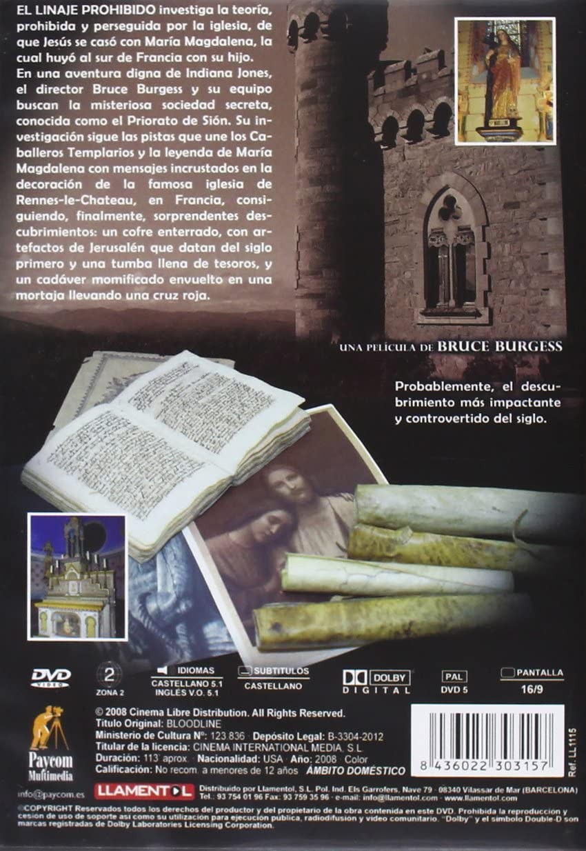Spain Edition, PAL/Region 2 DVD : LANGUAGES: Spanish (Dolby Digital 5.1), English (Dolby Digital 5.1), Spanish (Subtitles), WIDESCREEN (1.78:1), EXTRAS: Scene Access, Interactive Menu, SYNOPSIS: The documentary investigates the theory, prohibited and persecuted by the Church, that Jesus married Mary Magdalene, who fled to the south of France with her son. In an adventure worthy of Indiana Jones , director Bruce Burgess and his team search for the mysterious secret society, known as the Priory of Sion. His investigation follows the clues that link the Knights Templar and the legend of Mary Magdalene with messages embedded in the decoration of the famous church of Rennes-le-Chateau, in France, finally achieving surprising discoveries: a buried chest, with artifacts of Jerusalem dating from the 1st century and a tomb full of treasures, and a mummified corpse wrapped in a shroud carrying a red cross. ...The Lost Lineage / Bloodline (2008)