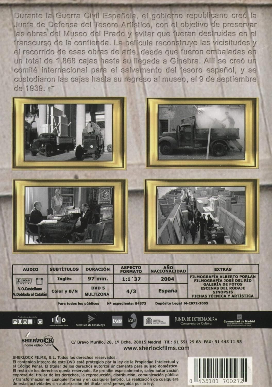 https://back.dvdstorespain.es/en/best-documentaries-on-blu-ray-and-dvd/130231-las-cajas-espanolas-dvd--8435181700272.html130231Las Cajas Españolas [DVD] (2004)Durante la Guerra Civil Española, el gobierno republicano creó la Junta de Defensa del Tesoro Artístico, con el objetivo de preservar las obras del Museo del Prado y evitar que fueran destruidas en el transcurso de la contienda. La película reconstruye las vicisitudes y el recorrido de esas obras de arte, desde que fueron embaladas en un total de 1.868 cajas hasta su llegada a Ginebra. Allí se creó un Comité Internacional para el Salvamento del Tesoro Español, y se custodiaron las cajas hasta su regreso al museo, el 9 de septiembre de 1939. https://dvdstorespain.es/1146180-home_default/las-cajas-espanolas-dvd-.jpg14.5455instock14.545514.5455002026-03-12T16:30:03+0100/Start/Start/DVD/Start/New/Start/Best Documentaries on Blu-Ray and DVD