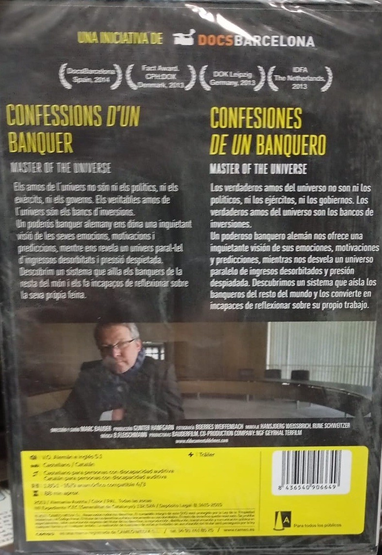 https://back.dvdstorespain.es/en/best-documentaries-on-blu-ray-and-dvd/16197-master-of-the-universe-dvd--8436540906649.html16197Confesiones de un Banquero [DVD] (2013) Master of the UniverseLos verdaderos amos del universo no son ni los políticos, ni los ejércitos, ni los gobiernos. Los verdaderos amos del universo son los bancos de inversiones. Un poderoso banquero alemán nos ofrece una inquietante visión de sus emociones, motivaciones y predicciones, mientras nos desvela un universo paralelo de ingresos desorbitados y presión despiadada. Descubrimos un sistema que aísla a los banqueros del resto del mundo y les convierte en incapaces de reflexionar sobre su propio trabajo. https://dvdstorespain.es/556202-home_default/master-of-the-universe-dvd-.jpg5.1694instockCameo Media,S.L.5.16945.1694002015-06-14T21:43:54+0200/Start/Start/DVD/Start/New/Start/Best Documentaries on Blu-Ray and DVD/Start/EVENING SP 70/Start/VELADA DE 80/Start/VELADA FR 80/Start/VELADA IT 80Mark Bauder