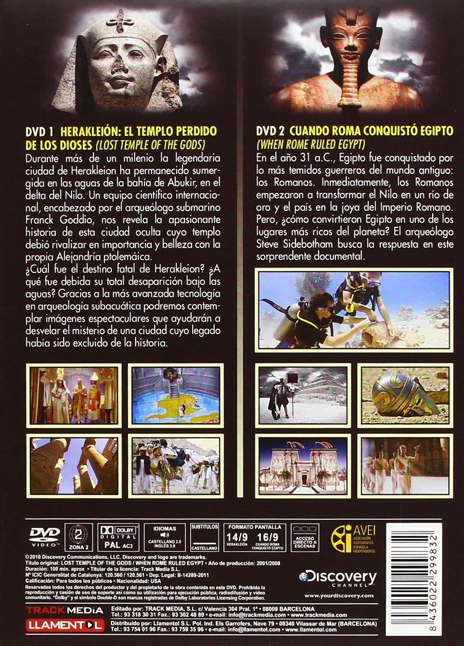 DVD 1 HERAKLEION: THE LOST TEMPLE OF THE GODS For more than a millennium the legendary city of Herakleion has remained submerged in the waters of Abukir Bay, in the Nile Delta. An international scientific team, headed by underwater archaeologist Franck Goddio, reveals the exciting history of this hidden city whose temple must have rivaled in importance and beauty with Ptolemaic Alexandria itself. What was the fatal fate of Herakleion? What was the reason for its total disappearance under the waters? Thanks to the most advanced technology in underwater archeology we will be able to contemplate spectacular images that will help reveal the mystery of a city whose legacy had been excluded from history. DVD 2 WHEN ROME CONQUERED EGYPT (WHEN ROME RULED EGYPT) In the year 31 aC , Egypt was conquered by the most feared warriors of the ancient world: the Romans. Immediately, the Romans began to transform the Nile into a river of gold and the country into the jewel of the Roman Empire. But how did they turn Egypt into one of the richest places on the planet? Archaeologist Steve Sidebotham seeks the answer in this surprising documenta
