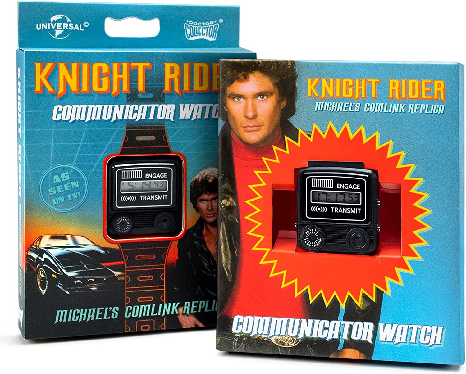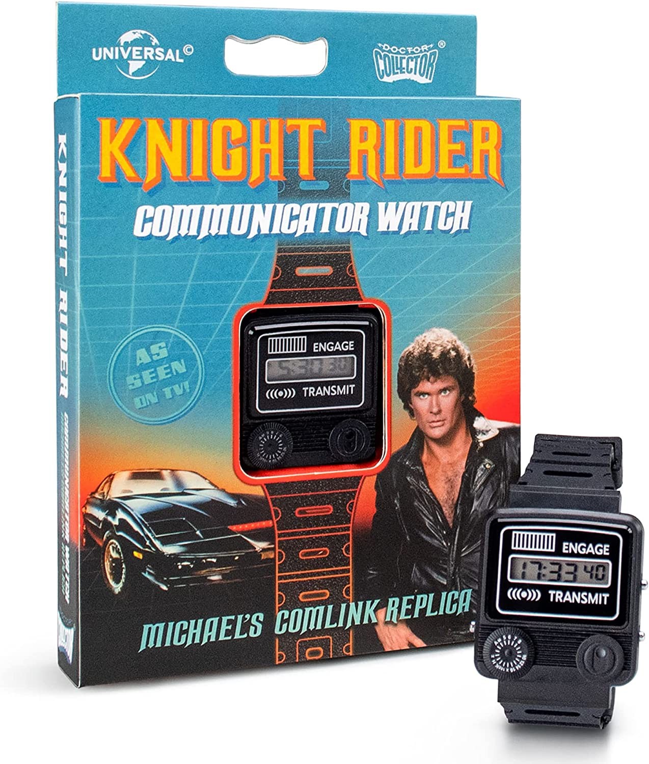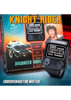 ¿Te sabes la musiquita de “El Coche Fantástico”? Seguro que sí. Si quieres hacer feliz a David Hasselhoff allá donde esté (probablemente California), llévate la espectacular réplica deL Comlink de Michael Knight. El icónico reloj comunicador de Michael de licencia oficial de Universal ha sido creado por Doctor Collector, la prestigiosa marca especializada en réplicas de los objetos más originales del cine y la televisión. Viene en una sensacional caja temática con ilustraciones y fotos de la serie y con una tapa que puedes abrir y ver las características del reloj: hora con seis dígitos, formato de 12h y 24h, función cronógrafo con cuenta separada 1/100. Además, en la parte trasera viene grabado el logo de Knight Industries. ¡Lleva en tu muñeca cada día tu pasión por esta fantástica serie que marcó época y llama a KITT! (No es un intercomunicador real).