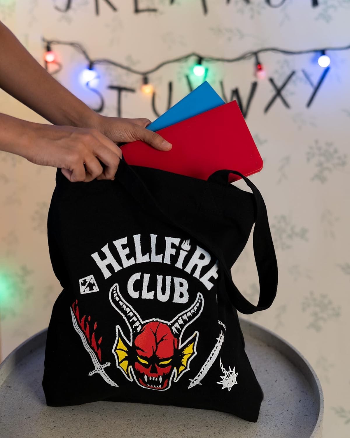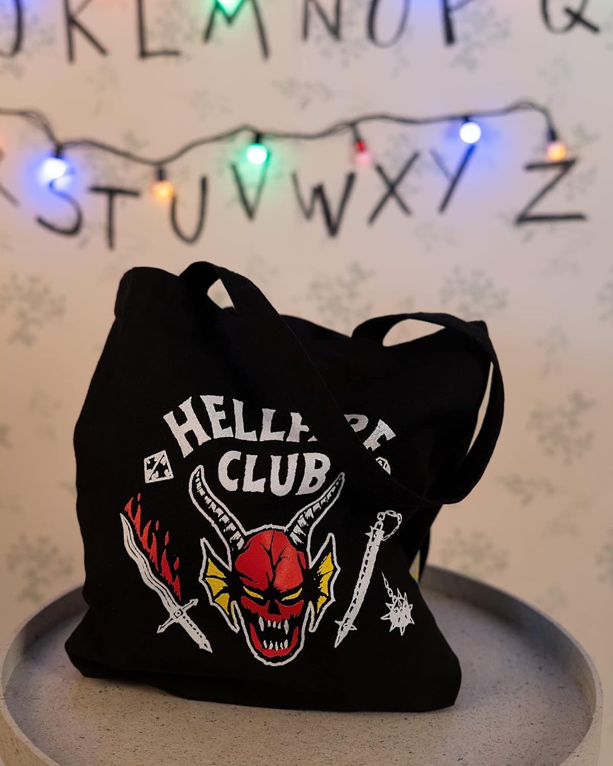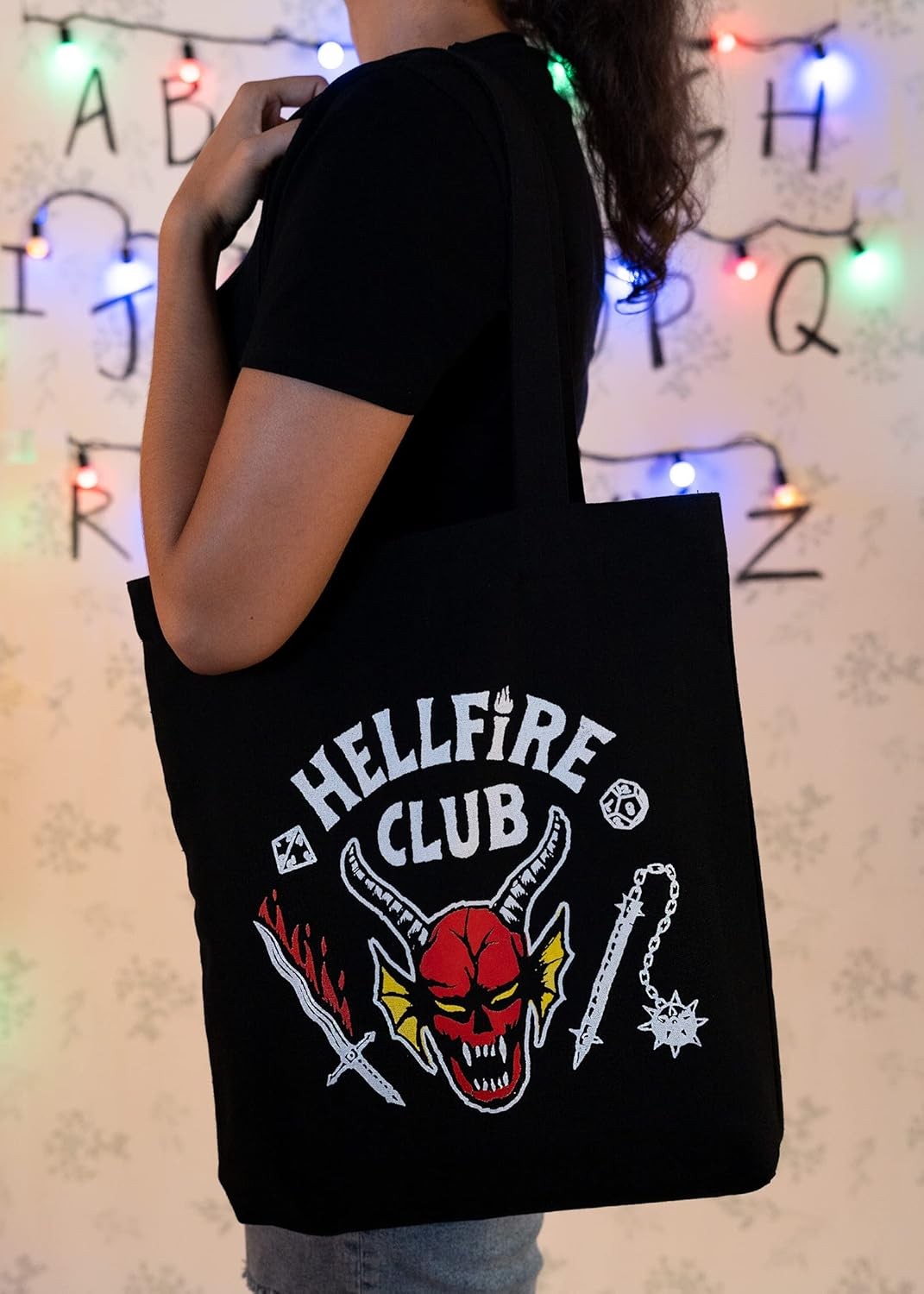 Esta tote bag oficial de Stranger Things – Hellfire Club no es solo una bolsa de algodón: es tu nuevo uniforme de aventurero urbano. Hecha para fans que llevan dados de 20 siempre a mano… ¡y ahora también las llaves, la libreta, el merch y hasta un waffler de emergencia! Con su diseño inspirado en el misterioso Hellfire Club y ese toque vintage ochentero que todos adoramos, esta bolsa no solo te acompaña a la compra, al cole o a la playa… también te acompaña en tu próxima misión contra el Upside Down. Bolsa Tote de tela en medidas de 37x39x10 cm con dos asas para llevarla al hombro. Fabricado 100% de algodón.