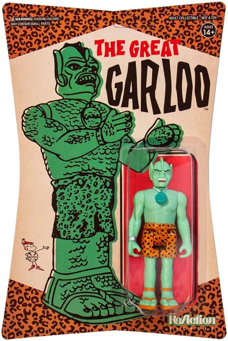 En 1961 un juguete nuevo tomó Estados Unidos como una ola. El Gran Garloo, uno de los juguetes más famosos para los coleccionistas de muñecos vintage, viene ahora en forma de figura de 10 cms gracias a Super7 y ReAction Figures. Este hombre anfibio tiene licencia oficial y viene en un blíster totalmente retro con estampado de leopardo y una ilustración del Gran Garloo en color verde con tinta negra. Está hecho de vinilo y tiene una textura en relieve que imita las escamas de la criatura.