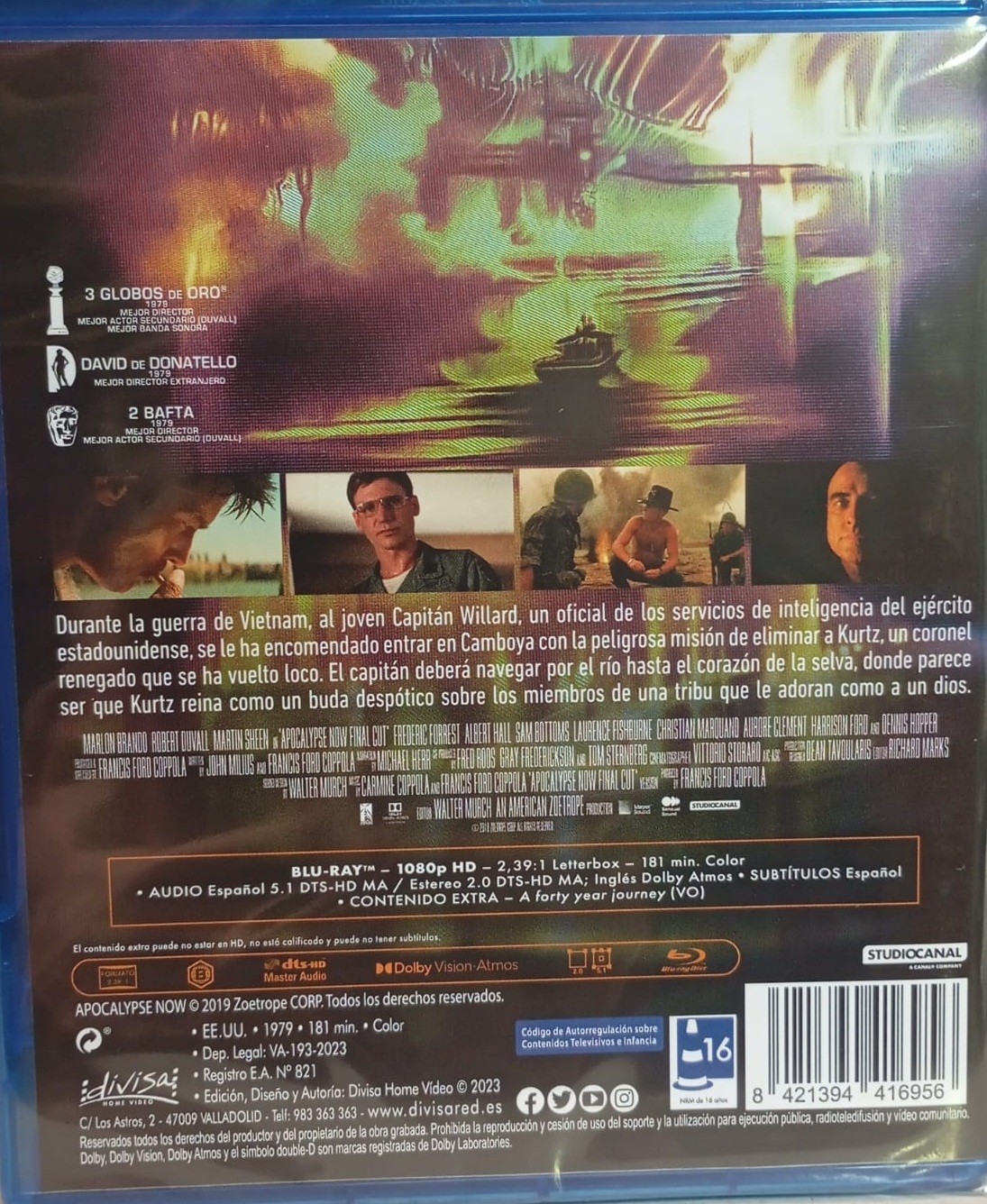 https://back.dvdstorespain.es/en/films/107101-apocalypse-now-final-cut-bluray--8421394416956.html107101Apocalypse Now Redux (Final Cut) [Blu-ray] (1979)Durante la guerra de Vietnam, al joven Capitán Willard, un oficial de los servicios de inteligencia del ejército estadounidense, se le ha encomendado entrar en Camboya con la peligrosa misión de eliminar a Kurtz, un coronel renegado que se ha vuelto loco. El capitán deberá ir navegar por el río hasta el corazón de la selva, donde parece ser que Kurtz reina como un buda despótico sobre los miembros de la tribu Montagnard, que le adoran como a un dios. https://dvdstorespain.es/613628-home_default/apocalypse-now-final-cut-bluray-.jpg10.6612instockDivisa Own DVD Catalog10.661210.6612002023-04-03T01:34:23+0200/Start/Start/Films/Start/New/Start/4K-UHD/Start/Homenaje a Robert Duvall
