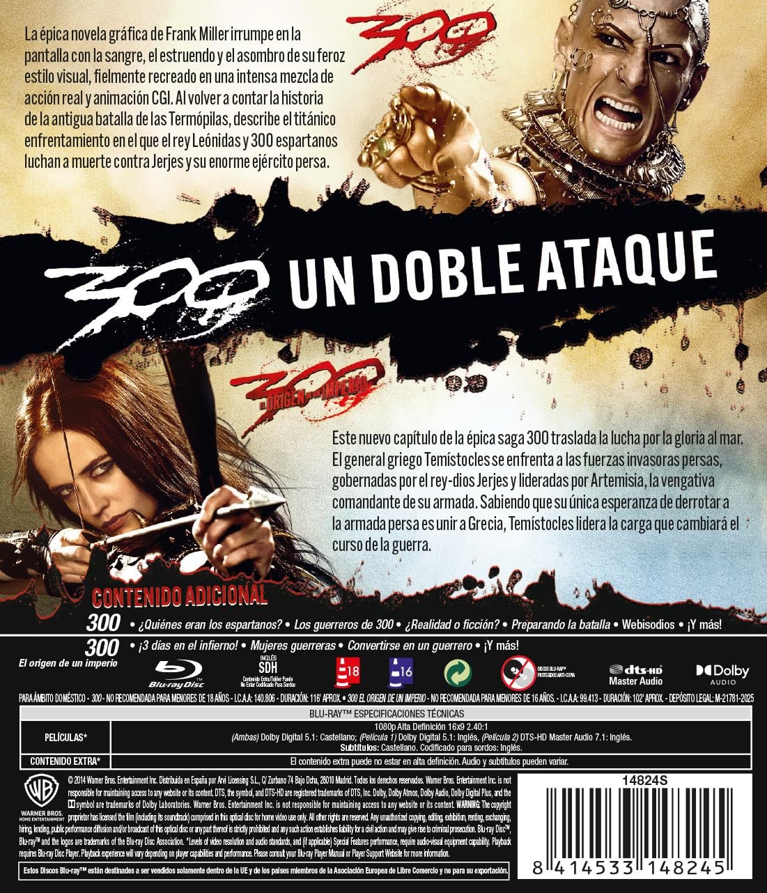 https://back.dvdstorespain.es/en/films/128072-300-300-el-origen-del-imperio-bd-blu-ray-2025--8414533148245.html128072300 + 300: El Origen De Un Imperio [Blu-ray] (2006, 2014) 300 + 300: Rise of an Empire<p><b>300</b><br />Adaptación del cómic de Frank Miller (autor del cómic 'Sin City') sobre la famosa batalla de las Termópilas (480 a.C.). El objetivo de Jerjes, emperador de Persia, era la conquista de Grecia, lo que desencadenó las Guerras Médicas. Dada la gravedad de la situación, el rey Leónidas de Esparta (Gerard Butler) y 300 espartanos se enfrentaron a un ejército persa que era inmensamente superior. </p><p><b>300: El origen de un imperio</b><br />Guerras médicas (500-479 a.C.). El general griego Temistocles lucha por conseguir la unidad de las polis griegas. Él dirige las tropas griegas que se enfrentan con el ejército persa, liderado por Xerxes y Artemisa, para impedir la invasión del país. Spin-off de la película/cómic 300, basado en la novela gráfica "Xerxes", de Frank Miller. </p>https://dvdstorespain.es/1104105-home_default/300-300-el-origen-del-imperio-bd-blu-ray-2025-.jpg22.2314instockARVI22.231422.2314002025-11-25T06:34:22+0100/Start/Start/Blu-Ray/Start/Films/Start/New