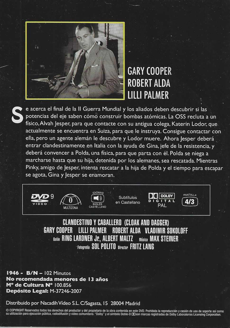 https://back.dvdstorespain.es/en/films/128880-clandestino-y-caballero-dvd-edicion-sobre-dvd-2024--0634065166229.html128880Clandestino y Caballero (Edición sobre) [DVD] (1946) Cloak and DaggerA punto de terminar la Segunda Guerra Mundial (1939-1945), los aliados tratan de impedir que los alemanes fabriquen la bomba atómica. Con este fin, la Organización de Servicios Estratégicos (OSS) recluta al físico nuclear Jesper y le encarga que busque a su colega Katerin Lodor y la saque de Suiza para interrogarla. Pero, cuando la encuentra, una enfermera nazi impide que la rescate. A continuación, la misión de Jesper consiste en ir a Italia y convencer al doctor Polda, otro físico nuclear, para que abandone a los nazis y colabore con los aliados. Pero Polda no podrá hacerlo mientras no libere a su hija. https://dvdstorespain.es/1121185-home_default/clandestino-y-caballero-dvd-edicion-sobre-dvd-2024-.jpg5.2893instock5.28935.2893002026-01-23T00:45:56+0100/Start/Start/DVD/Start/Films/Start/New