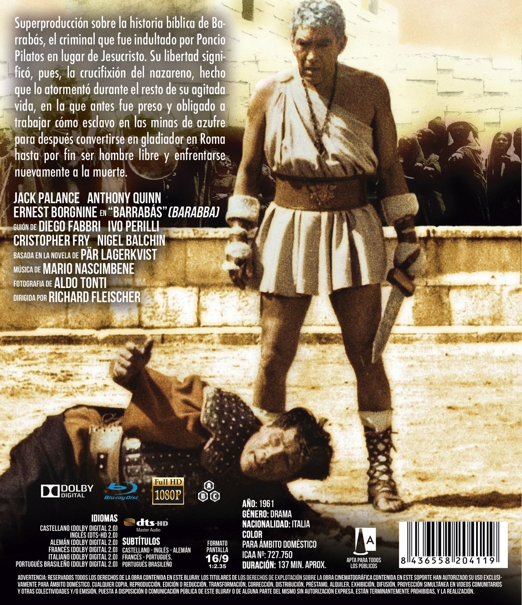 https://back.dvdstorespain.es/en/films/128974-barrabas-blu-ray-1961-barabba-barabbas-blu-ray-2026--8436558204119.html128974Barrabás [Blu-ray] (1961) BarabbaSuperproducción sobre la historia bíblica de Barrabás, el criminal que fue indultado por Poncio Pilatos en lugar de Jesucristo. Su libertad significó, pues, la crucifixión del nazareno, hecho que lo atormentó durante el resto de su agitada vida, en la que antes fue preso y obligado a trabajar cómo esclavo en las minas de azufre para después convertirse en gladiador en Roma hasta por fin ser hombre libre y enfrentarse nuevamente a la muerte.https://dvdstorespain.es/1123676-home_default/barrabas-blu-ray-1961-barabba-barabbas-blu-ray-2026-.jpg10.7025instock10.702510.7025002026-01-31T03:16:03+0100/Start/Start/Blu-Ray/Start/Films/Start/New