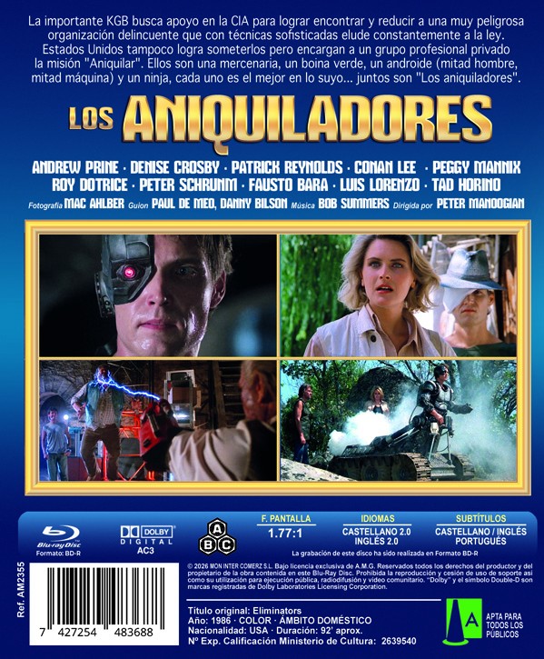 https://back.dvdstorespain.es/en/films/129124-los-aniquiladores-bdr-eliminators-blu-ray-2026--7427254483688.html129124Los Aniquiladores [Blu-ray R] (1986) Eliminators<p>La importante KGB busca apoyo en la CIA para lograr encontrar y reducir a una muy peligrosa organización delincuente que con técnicas sofisticadas elude constantemente a la ley. Estados Unidos tampoco logra someterlos pero encargan a un grupo profesional privado la misión "Aniquilar". Ellos son una mercenaria, un boina verde, un androide (mitad hombre, mitad máquina) y un ninja, cada uno es el mejor en lo suyo... juntos son "Los aniquiladores".</p>https://dvdstorespain.es/1125764-home_default/los-aniquiladores-bdr-eliminators-blu-ray-2026-.jpg9.876instock9.8769.876002026-02-05T00:15:03+0100/Start/Start/Films/Start/New/Start/NOT EBY DVDR-BDR/Start/Blu-ray R