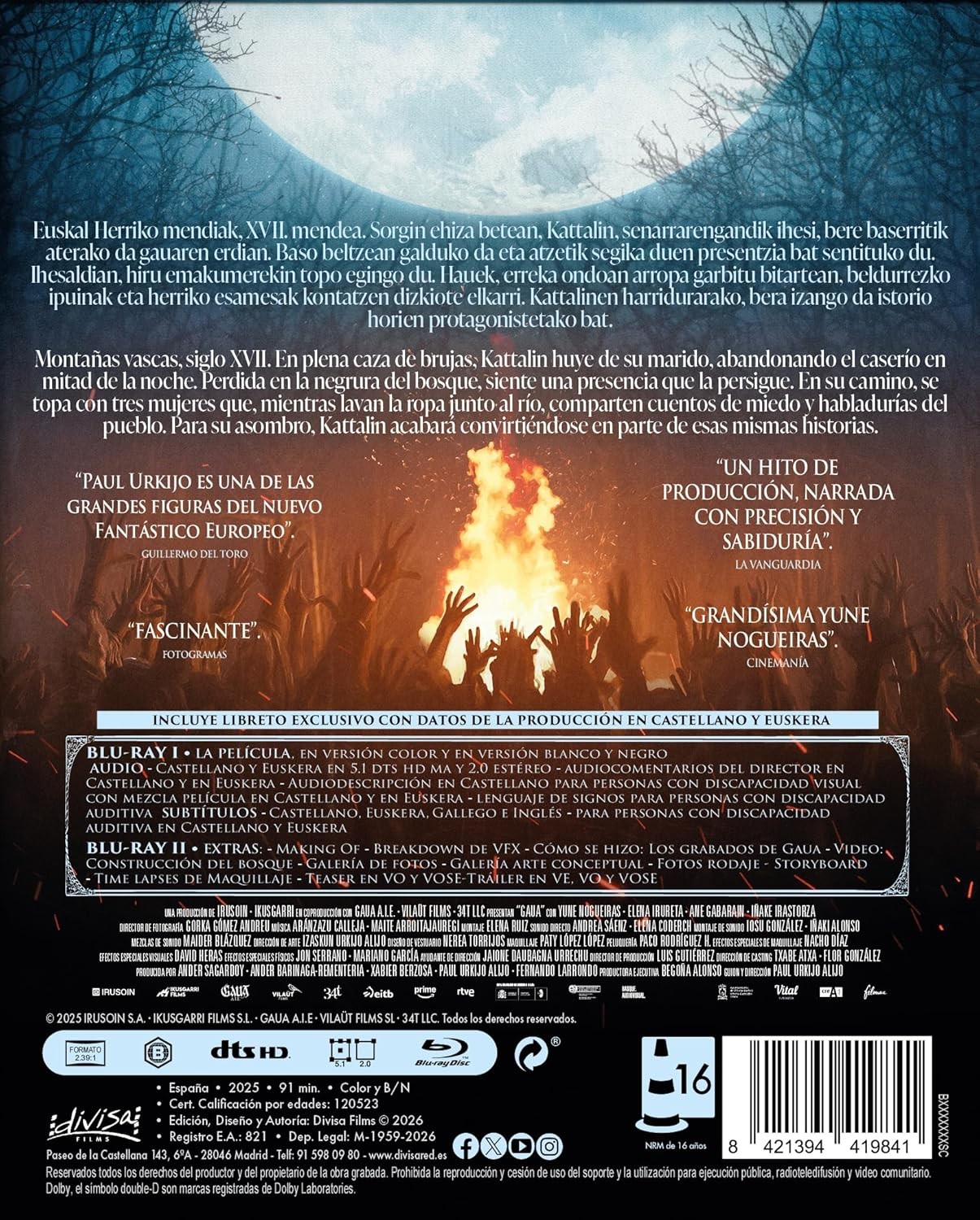 https://back.dvdstorespain.es/en/films/129135-gaua-edicion-coleccionista-digipack-libreto-32-paginas-blu-ray-blu-ray-extras-blu-ray-2026--8421394419841.html129135Gaua (Edición coleccionista, 2 discos, libreto) [Blu-ray, Libreto] (2025)Montañas vascas, siglo XVII. En plena caza de brujas, Kattalin huye de su marido, abandonando el caserío en mitad de la noche. Perdida en la negrura del bosque, siente una presencia que la persigue. En su camino, se topa con tres mujeres que, mientras lavan la ropa junto al río, comparten cuentos de miedo y habladurías del pueblo. Para su asombro, Kattalin acabará convirtiéndose en parte de esas mismas historias.https://dvdstorespain.es/1126261-home_default/gaua-edicion-coleccionista-digipack-libreto-32-paginas-blu-ray-blu-ray-extras-blu-ray-2026-.jpg21.4876instock21.487621.4876002026-02-05T21:30:02+0100/Start/Start/Blu-Ray/Start/Films/Start/New