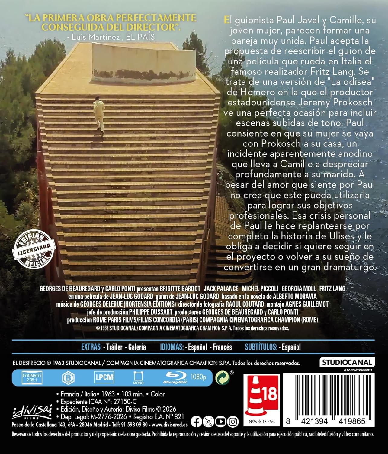 https://back.dvdstorespain.es/en/films/129136-el-desprecio-le-mepris-1963-jean-luc-godard-blu-ray-blu-ray-2026--8421394419865.html129136El Desprecio [Blu-ray] (1963) Le MéprisPaul Javal (Michel Piccoli), un dramaturgo francés, acepta reescribir algunas escenas para "La Odisea", una película que se va a rodar en Capri bajo la dirección del renombrado director alemán Fritz Lang (Fritz Lang). En un primer encuentro con el productor norteamericano, el arrogante Prokosch (Jack Palance), el escritor deja que su mujer, la bella Camille (Brigitte Bardot), se vaya en el coche con el productor a la finca de éste. Este hecho dará lugar a un grave mal entendido entre el Javal y su esposa, quien cree que la ha ofrecido como moneda de cambio para obtener un mejor pago. Como consecuencia de esta situación, el escritor se verá inmerso en una dolorosa crisis matrimonial. https://dvdstorespain.es/1126267-home_default/el-desprecio-le-mepris-1963-jean-luc-godard-blu-ray-blu-ray-2026-.jpg11.9835instock11.983511.9835002026-02-05T21:30:12+0100/Start/Start/Blu-Ray/Start/Films/Start/New