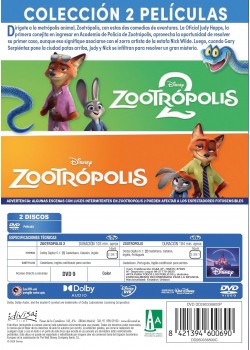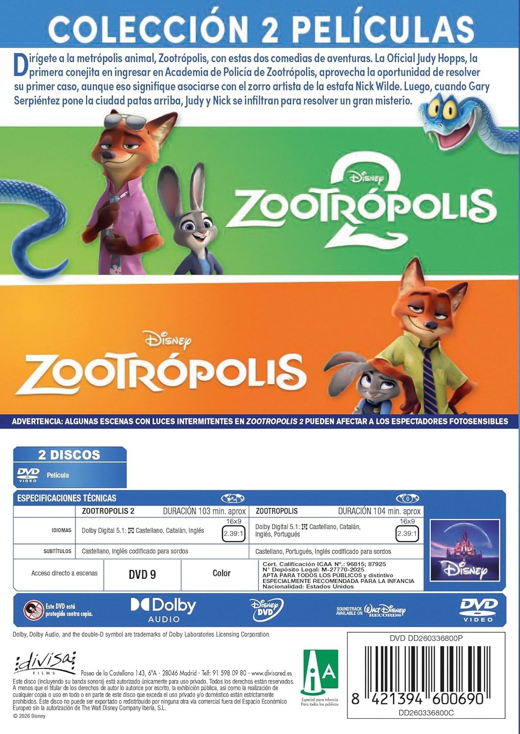 https://back.dvdstorespain.es/en/films/129148-zootropolis-12-pack-2-peliculas-dvd-dvd-2026--8421394600690.html129148Zootrópolis: Colección 2 Películas (Colección 2 películas) [DVD] (2016, 2025)<p><b>ZootrópolisAnimación</b><b> (Zootopia)</b><br />La moderna metrópoli mamífera de Zootrópolis es una ciudad absolutamente única. Está compuesta de barrios con diferentes hábitats como la lujosa Sahara Square y la gélida Tundratown. Es un crisol donde los animales de cada entorno conviven, un lugar donde no importa lo que seas. De hecho puedes ser cualquier cosa, desde un elefante enorme hasta la musaraña más diminuta. Pero cuando llega la optimista agente Judy Hopps, descubre que ser la primera conejita de un cuerpo policial compuesto de animales duros y enormes no es nada fácil. Pero está decidida a demostrar su valía y se mete de cabeza en un caso, a pesar de que eso significa trabajar con Nick Wilde, un zorro parlanchín y estafador, para resolver el misterio.</p>