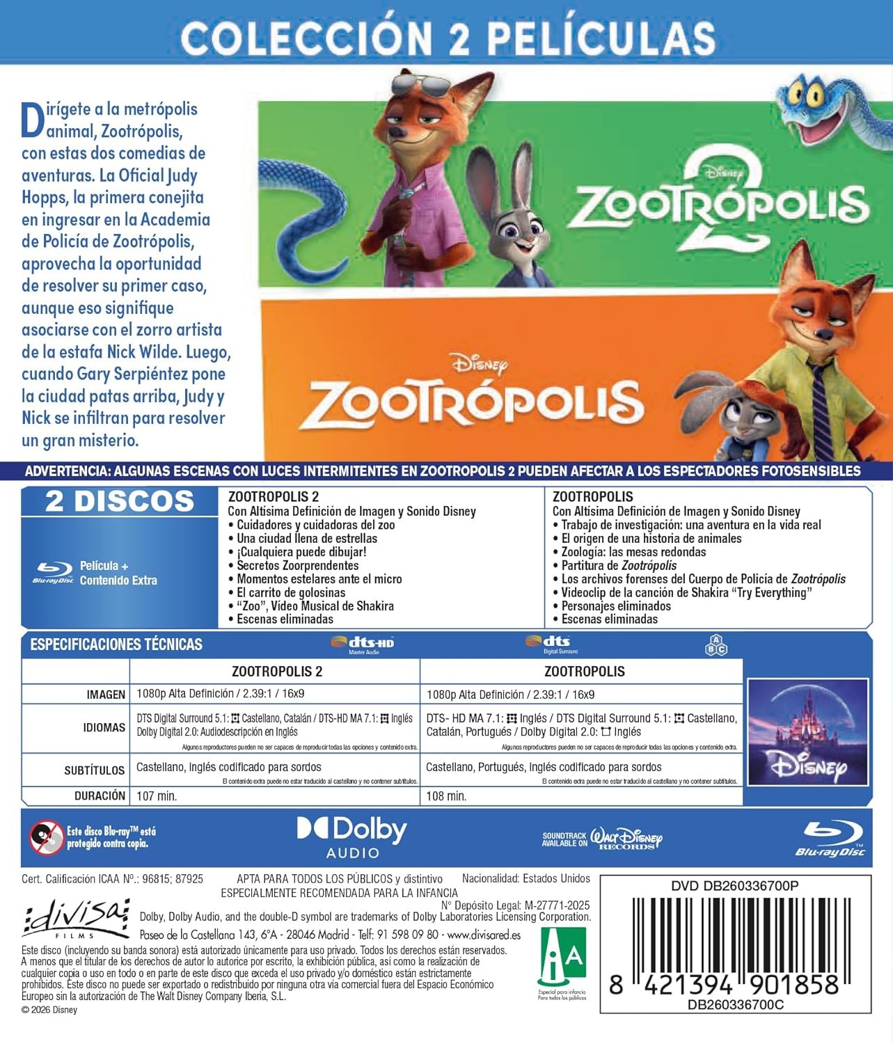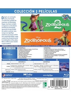 https://back.dvdstorespain.es/en/films/129158-zootropolis-12-pack-2-peliculas-blu-ray-blu-ray-2026--8421394901858.html129158Zootrópolis: Colección 2 Películas (2 discos) [Blu-ray] (2016, 2025)<p><b>ZootrópolisAnimación</b><b> (Zootopia)</b><br />La moderna metrópoli mamífera de Zootrópolis es una ciudad absolutamente única. Está compuesta de barrios con diferentes hábitats como la lujosa Sahara Square y la gélida Tundratown. Es un crisol donde los animales de cada entorno conviven, un lugar donde no importa lo que seas. De hecho puedes ser cualquier cosa, desde un elefante enorme hasta la musaraña más diminuta. Pero cuando llega la optimista agente Judy Hopps, descubre que ser la primera conejita de un cuerpo policial compuesto de animales duros y enormes no es nada fácil. Pero está decidida a demostrar su valía y se mete de cabeza en un caso, a pesar de que eso significa trabajar con Nick Wilde, un zorro parlanchín y estafador, para resolver el misterio.</p><p><b>Zootrópolis 2Animación</b><b> (Zootopia 2)</b><br />Judy y Nick se encuentran tras la retorcida pista de un misterioso reptil que llega a Zootopia y pone patas arriba la metrópolis de los mamíferos. Para resolver el caso, Judy y Nick deben ir de incógnito a nuevas partes inesperadas de la ciudad, donde su creciente asociación se pone a prueba como nunca antes.</p>https://dvdstorespain.es/1126372-home_default/zootropolis-12-pack-2-peliculas-blu-ray-blu-ray-2026-.jpg22.3141instock22.314122.3141002026-02-05T21:47:36+0100/Start/Start/Blu-Ray/Start/Films/Start/New