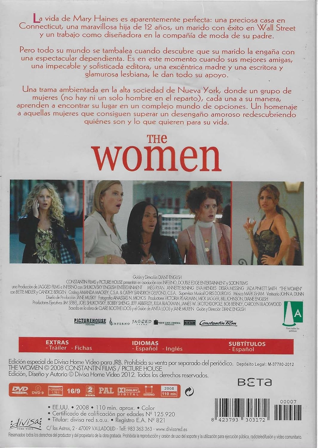 https://back.dvdstorespain.es/en/films/129173-the-women-dvd-edicion-slim-dvd-2024--0634065166830.html129173The Women (Edición Slim) [DVD] (2008)Remake del film de 1939 de George Cukor. La vida de Mary Haines (Meg Ryan) es aparentemente perfecta: una preciosa casa en Connecticut, una hija de doce años, un marido con éxito en Wall Street, un trabajo como diseñadora en la empresa de moda de su padre. Tiene, además, buenas amigas: la mejor de todas es la estilosa Sylvia Fowler (Annette Bening), que trabaja como editora de una popular revista femenina; las otras son la excéntrica Edie Cohen (Debra Messing) y la escritora Alex Fisher (Jada Pinkett Smith), una sofisticada lesbiana. Pero la vida de Mary dará un vuelco cuando Sylvie se entera de que una dependienta de la sección de perfumería (Eva Mendes) tiene una aventura con el marido de Mary. https://dvdstorespain.es/1126956-home_default/the-women-dvd-edicion-slim-dvd-2024-.jpg5.2893instock5.28935.2893002026-02-08T06:45:02+0100/Start/Start/DVD/Start/Films/Start/New