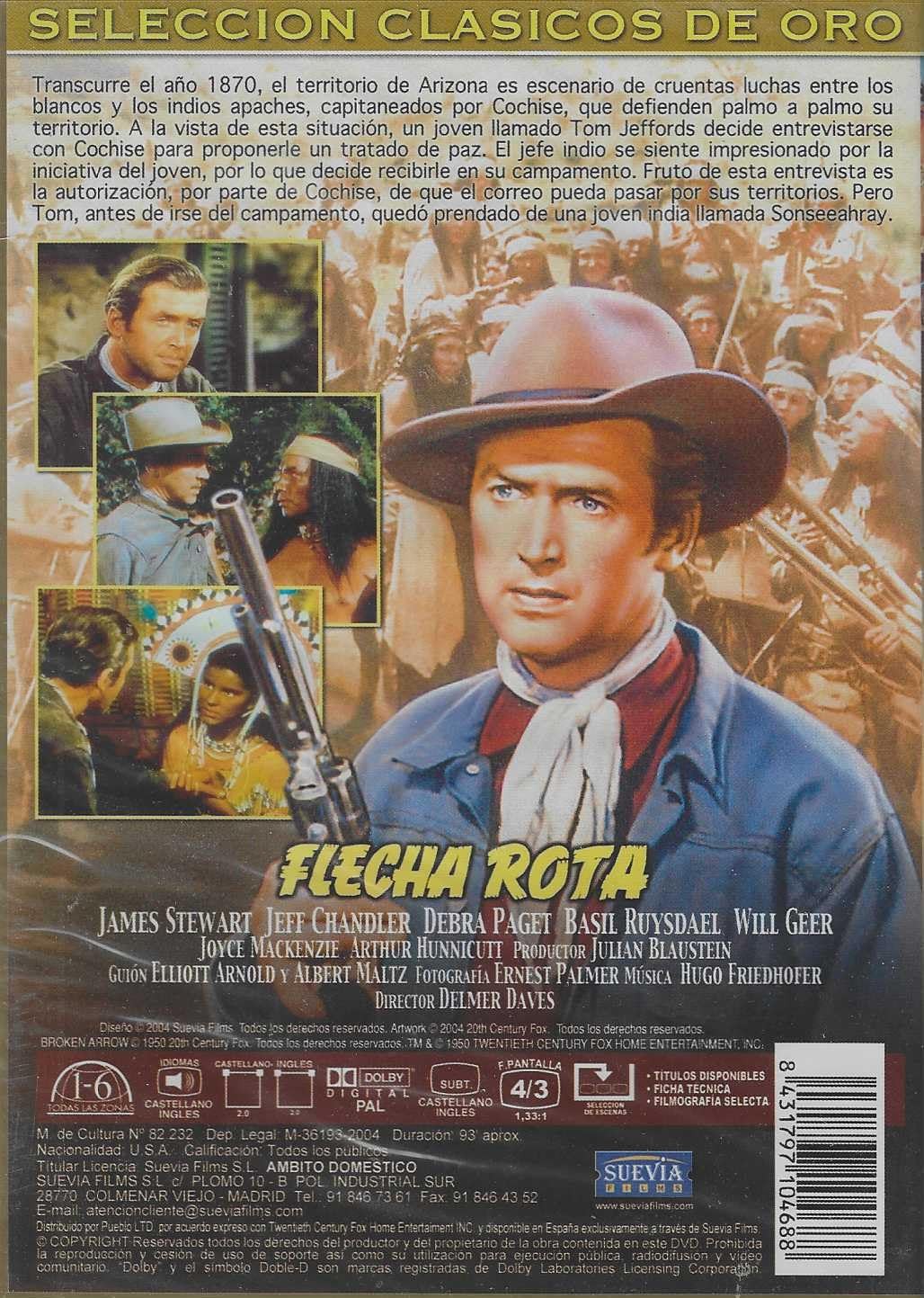 https://back.dvdstorespain.es/en/films/129284-flecha-rota-dvd-dvd-2024--605848410488.html129284Flecha Rota [DVD] (1950) Broken ArrowEn 1870, el territorio de Arizona es escenario de cruentas luchas entre los blancos y los apaches, capitaneados por Cochise, que defienden palmo a palmo su territorio. En estas circunstancias, Tom Jeffords decide entrevistarse con Cochise para proponerle un tratado de paz. El jefe indio, impresionado por la audacia del joven, lo recibe en su campamento. La entrevista es fructífera y Cochise autoriza que el correo pueda pasar por sus territorios. Durante su estancia en el campamento, Tom se enamora de una joven india. https://dvdstorespain.es/1130677-home_default/flecha-rota-dvd-dvd-2024-.jpg9.0909instock9.09099.0909002026-02-19T02:45:16+0100/Start/Start/DVD/Start/Films/Start/New
