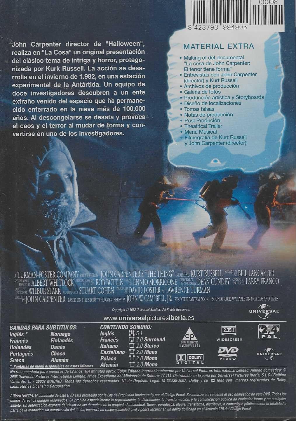 https://back.dvdstorespain.es/en/films/129473-la-cosa-dvd-coleccion-cine-de-terror-edicion-slim-dvd-2024--605848384932.html129473La Cosa (Colección cine de terror, Edición Slim) [DVD] (1982) The ThingEn una estación experimental remota de la Antártida, un equipo de científicos de investigación estadounidenses ven cómo en su campamento base un helicóptero noruego dispara contra un perro de trineo. Cuando acogen al perro, éste ataca brutalmente tanto a los seres humanos como a los caninos del campamento, y descubren que la bestia, de origen desconocido, puede asumir la forma de sus víctimas... https://dvdstorespain.es/1133496-home_default/la-cosa-dvd-coleccion-cine-de-terror-edicion-slim-dvd-2024-.jpg6.6116instock6.61166.6116002026-02-24T02:46:25+0100/Start/Start/DVD/Start/Films/Start/New