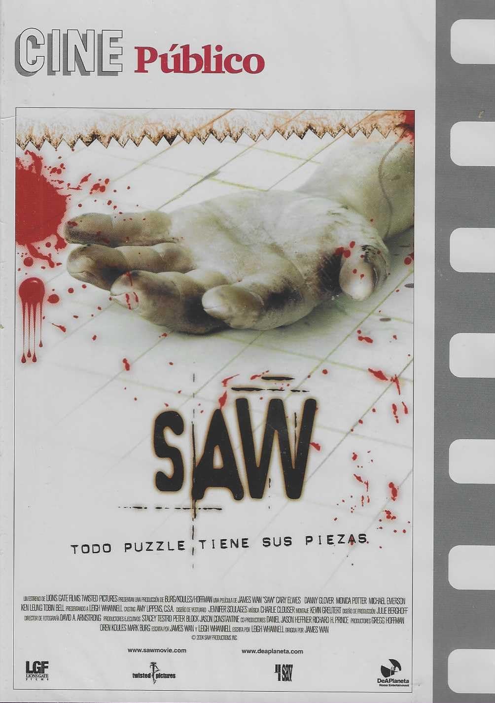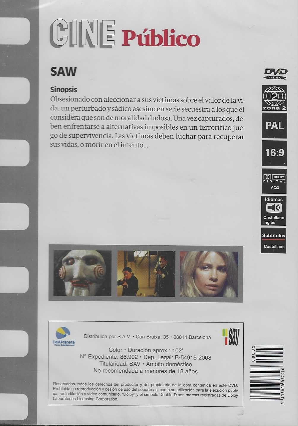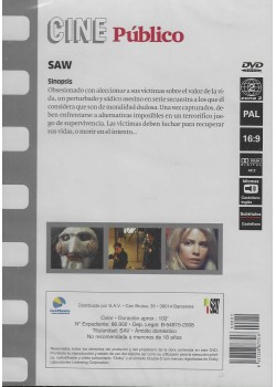 https://back.dvdstorespain.es/en/films/129475-saw-dvd-edicion-slim-coleccion-cine-publico-dvd-2024--605848638684.html129475Saw (Edición Slim, Colección Cine Público) [DVD] (2004)Adam se despierta encadenado dentro de una decrépita cámara subterránea. A su lado, hay otra persona encadenada, el Dr. Lawrence Gordon. Entre ellos hay un hombre muerto. Ninguno de los dos sabe por qué está allí, pero tienen un casette con instrucciones para que el Dr. Gordon mate a Adam en un plazo de ocho horas. Recordando una investigación de asesinato llevada a cabo por un detective llamado Tapp, Gordon descubre que él y Adam son victimas de un psicópata conocido como Jigsaw. Sólo disponen de unas horas para desenredar el complicado rompecabezas en el que están inmersos. https://dvdstorespain.es/1133500-home_default/saw-dvd-edicion-slim-coleccion-cine-publico-dvd-2024-.jpg6.6116instock6.61166.6116002026-02-24T02:46:34+0100/Start/Start/DVD/Start/Films/Start/New