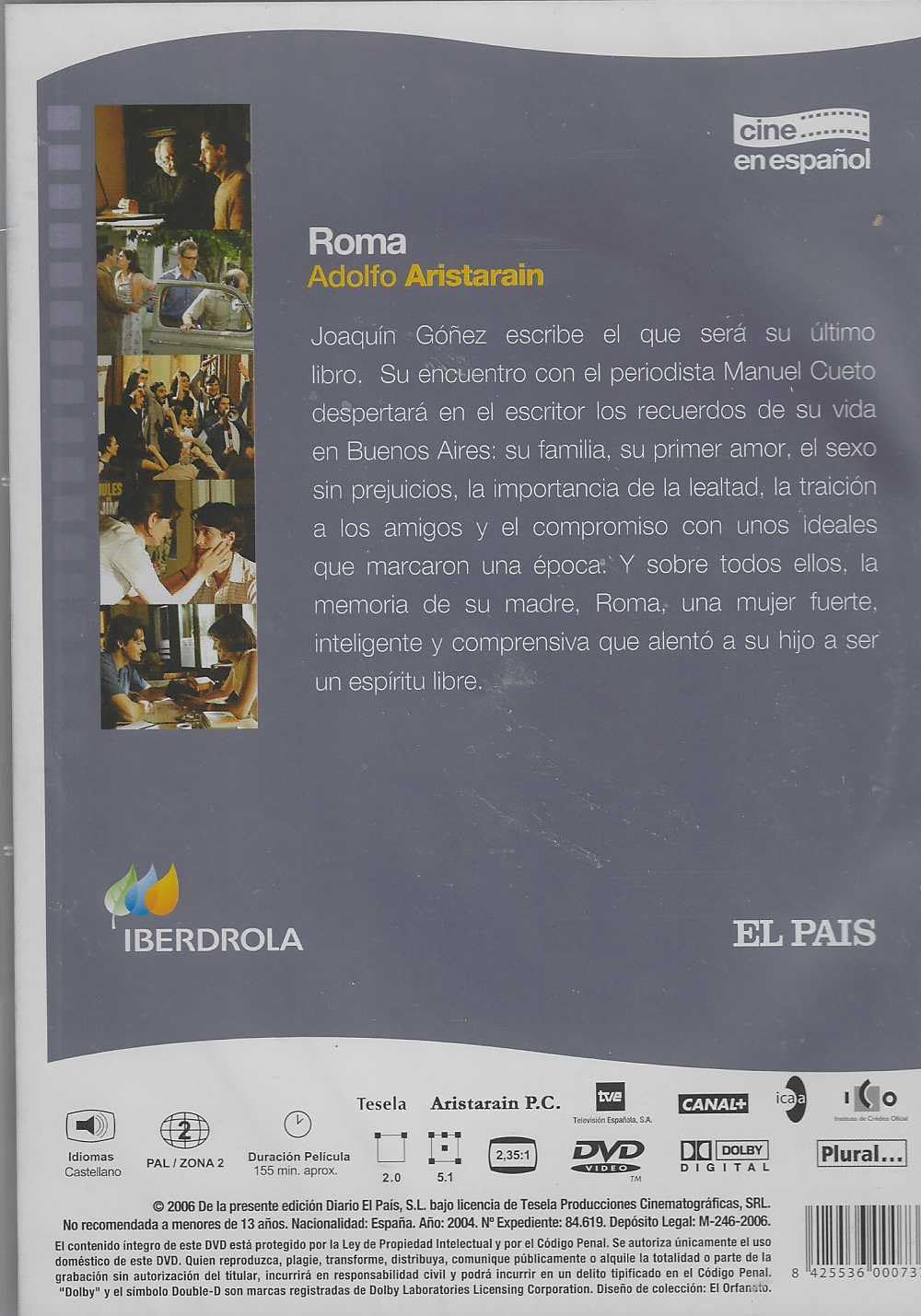 https://back.dvdstorespain.es/en/films/129868-roma-dvd-edicion-slim-dvd-2024--605848548679.html129868Roma (Edición Slim) [DVD] (2004)La irrupción del periodista Manuel Cueto en la vida del escritor Joaquín Góñez, a instancias de la editorial para la que Joaquín está escribiendo su último libro, provocará un gran desasosiego en la solitaria vida de este hombre que vive de espaldas al mundo y rehuye sus propios recuerdos. Acostumbrado a la soledad, el encuentro con el joven periodista despertará en él emociones olvidadas que lo transportan a la época de su niñez y a su locos años de juventud en Buenos Aires: los errores de la inexperiencia, el recuerdo de los amigos, de la lealtad, la influencia del cine y del jazz, el sabor del primer amor, y la íntima relación con sus padres, especialmente con su madre, Roma, una mujer inteligente, fuerte, comprensiva y comprometida con los ideales de juventud de su hijo. Recuerda sobre todo la inmensa confianza que su madre depositó en él. A ella, sin duda, le debe Joaquín el haber sido siempre un espíritu libre, bohemio, fiel a sí mismo y a sus ideales. Y es precisamente el recuerdo imborrable de Roma el que despertará en él el deseo impaciente por recuperar todo lo que hasta ese momento creía perdido. https://dvdstorespain.es/1139690-home_default/roma-dvd-edicion-slim-dvd-2024-.jpg6.6116instock6.61166.6116002026-02-27T11:15:02+0100/Start/Start/DVD/Start/Films/Start/New