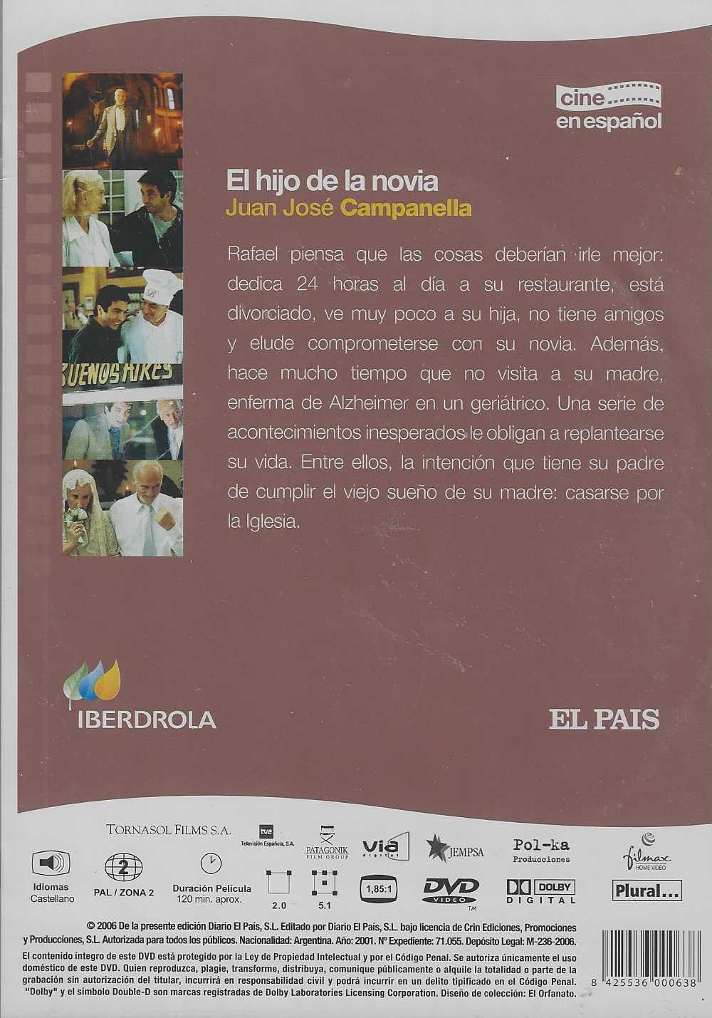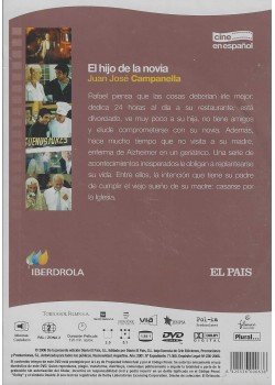 https://back.dvdstorespain.es/en/films/129876-el-hijo-de-la-novia-dvd-edicion-slim-dvd-2024--605848185386.html129876El Hijo de la Novia (Edición Slim) [DVD] (2001)Rafael dedica 24 horas al día a su restaurante, está divorciado, ve muy poco a su hija, no tiene amigos y elude comprometerse con su novia. Además, desde hace mucho tiempo no visita a su madre, internada en un geriátrico porque sufre el mal de Alzheimer. Una serie de acontecimientos inesperados le obligan a replantearse su vida. Entre ellos, la intención que tiene su padre de cumplir el viejo sueño de su madre: casarse por la Iglesia. https://dvdstorespain.es/1139706-home_default/el-hijo-de-la-novia-dvd-edicion-slim-dvd-2024-.jpg6.6116instock6.61166.6116002026-02-27T11:15:54+0100/Start/Start/DVD/Start/Films/Start/New