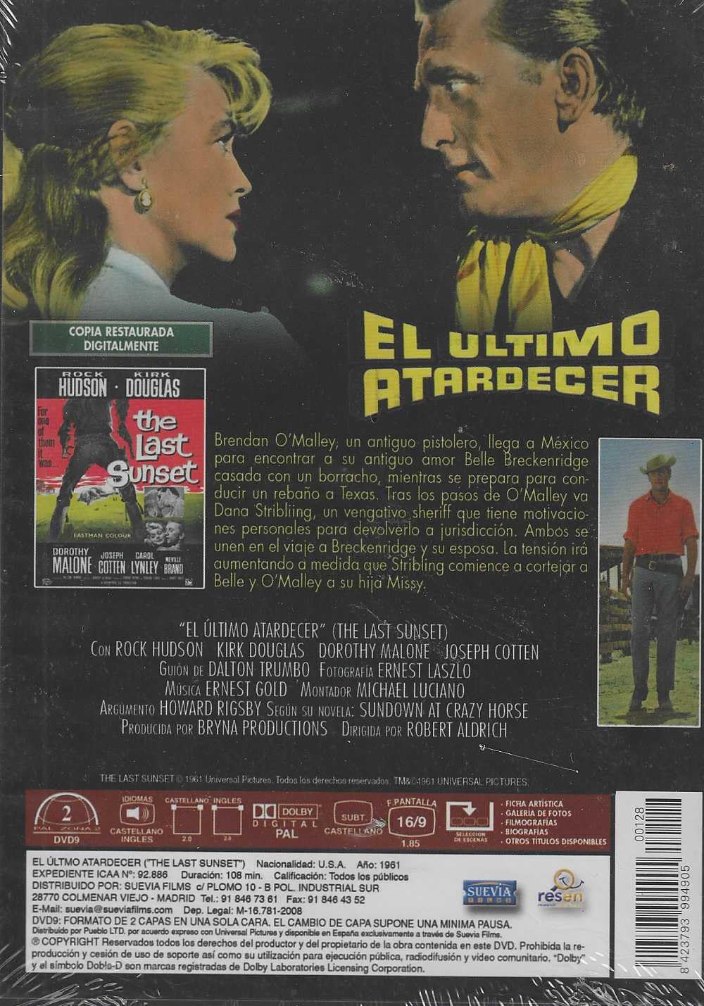 https://back.dvdstorespain.es/en/films/129934-el-ultimo-atardecer-dvd-edicion-slim-dvd-2024--0605848172010.html129934El Último Atardecer (Edición Slim) [DVD] (1961) The Last SunsetBrendan O'Malley (Kirk Douglas), un antiguo pistolero, llega a México para buscar a Belle Breckenridge (Dorothy Malone), que resulta estar casada con un borracho (Cotten). Éste le pide ayuda para conducir un rebaño a Texas. Tras los pasos de O'Malley va Dana Stribling (Rock Hudson), un vengativo sheriff que tiene motivos personales para arrestarlo. https://dvdstorespain.es/1140625-home_default/el-ultimo-atardecer-dvd-edicion-slim-dvd-2024-.jpg4.6281instock4.62814.6281002026-02-28T16:45:39+0100/Start/Start/DVD/Start/Films/Start/New