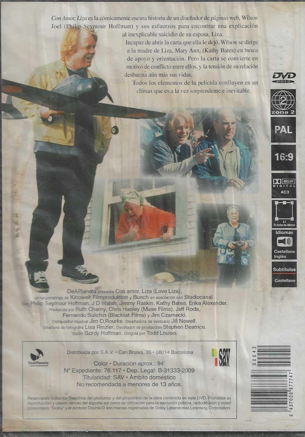 https://back.dvdstorespain.es/en/films/130000-con-amor-liza-dvd-edicion-slim-dvd-2024--0605848138382.html130000Con Amor, Liza (Edición Slim) [DVD] (2002) Love LizaTras el suicidio de su joven esposa Liza, un diseñador de páginas web de éxito se encuentra abatido y confuso. Intenta encontrarle un sentido a lo que ha pasado, pero, al mismo tiempo, es incapaz de abrir la carta de suicidio de su mujer o de aceptar la ayuda de su suegra. Se consuela "colocándose" y trata de evadirse dedicándose al aeromodelismo. https://dvdstorespain.es/1141760-home_default/con-amor-liza-dvd-edicion-slim-dvd-2024-.jpg5.2893instock5.28935.2893002026-03-01T22:45:02+0100/Start/Start/DVD/Start/Films/Start/New