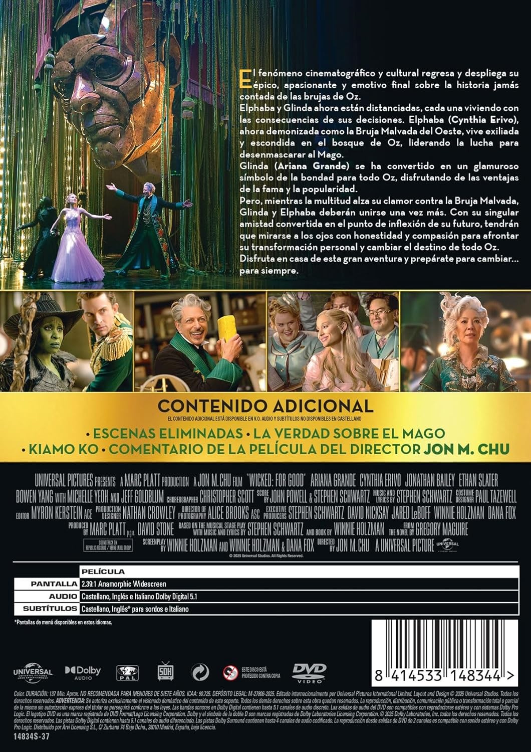 https://back.dvdstorespain.es/en/films/130013-wicked-parte-ii-dvd-dvd-2026--8414533148344.html130013Wicked: Parte II [DVD] (2025) Wicked: For GoodSegunda parte de la adaptación cinematográfica del musical de Broadway. El capítulo final de la historia jamás contada de las brujas de Oz comienza con Elphaba y Glinda distanciadas y viviendo las consecuencias de sus respectivas decisiones. Mientras la multitud alza su clamor contra la Bruja Malvada, ambas deberán unirse una vez más. Con su singular amistad convertida en el punto de inflexión de su futuro, tendrán que mirarse a los ojos con honestidad y compasión para afrontar su transformación personal y cambiar el destino de todo Oz. https://dvdstorespain.es/1142049-home_default/wicked-parte-ii-dvd-dvd-2026-.jpg16.4876instock16.487616.4876002026-03-02T20:45:02+0100/Start/Start/DVD/Start/Films/Start/New