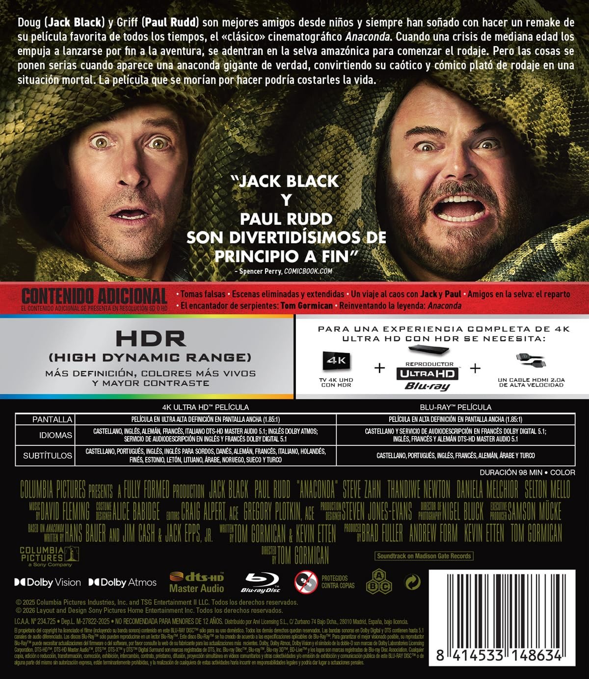https://back.dvdstorespain.es/en/films/130023-anaconda-2025-4k-uhd-bd-blu-ray-2026--8414533148634.html130023Anaconda (2025) [4K UHD, Blu-ray] (2025)Doug y Griff son muy buenos amigos desde que eran niños y siempre han soñado con hacer un remake de su película favorita de todos los tiempos: el «clásico cinematográfico» Anaconda. Cuando una crisis de mediana edad les anima a lanzarse por fin a la aventura, se adentran en la selva amazónica para empezar a rodar. Pero las cosas se ponen serias cuando aparece una anaconda gigante de verdad, convirtiendo su caótico y cómico plató de rodaje en una situación mortal. ¿La película que se morían por hacer, podría ser la que les mate?https://dvdstorespain.es/1142069-home_default/anaconda-2025-4k-uhd-bd-blu-ray-2026-.jpg22.2314instock22.231422.2314002026-03-02T20:46:37+0100/Start/Start/Films/Start/New/Start/4K-UHD