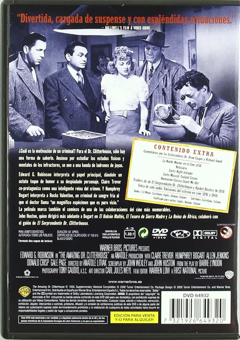 https://back.dvdstorespain.es/en/films/130279-sorprendente-dr-clitterhouse-dvd-2008--7321926649320.html130279El Sorprendente Dr. Clitterhouse [DVD] (1938) The Amazing Doctor ClitterhouseEl eminente doctor Clitterhouse (Edward G. Robinson) llega más lejos que todos sus colegas en su afán por desentrañar el misterio que hace que un hombre se convierta en un delincuente. Propulsor de un particular método y, convencido de que él es el mejor sujeto de experimentación, decide llevar a cabo una extraña prueba que le permita concluir si el hombre cae en el delito por necesidad o por la sublimación de los sentidos. https://dvdstorespain.es/1146951-home_default/sorprendente-dr-clitterhouse-dvd-2008-.jpg11.9008instock11.900811.9008002026-03-13T20:15:08+0100/Start/Start/DVD/Start/Films/Start/New
