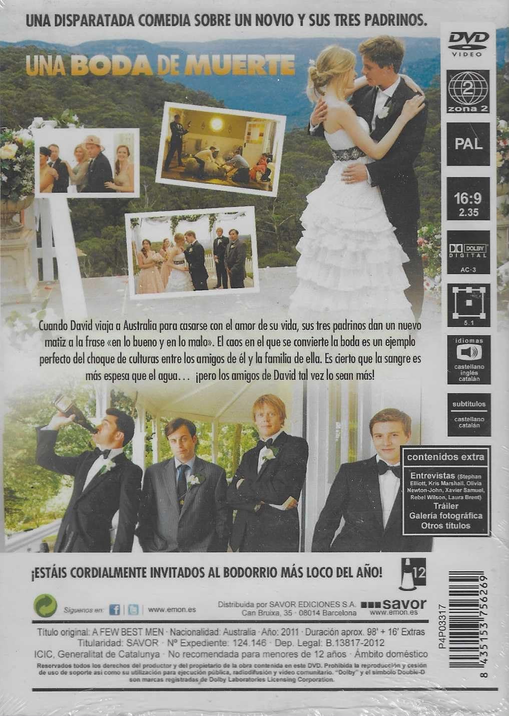 https://back.dvdstorespain.es/en/films/130313-una-boda-de-muerte-dvd-dvd-2024--8435153756269.html130313Una Boda de Muerte [DVD] (2011) a Few Best MenDavid, que está a punto de casarse con Mia, viaja con sus amigos hasta el pueblo de su novia, en el outback australiano, donde tendrá lugar la ceremonia. El padre de Mia es un rico senador australiano, pero la madre es una mujer algo alocada, aficionada a la cocaína y al alcohol. Los amigos de David son Luke, que será el padrino y que acaba de perder a su novia; Tom, un pasota total, y Graham, un hipocondríaco acomplejado. En principio, los padres de Mia reciben a David y a sus amigos con los brazos abiertos, pero en la despedida de soltero las cosas se desmadran y la boda no resulta ser lo que debiera.https://dvdstorespain.es/1147453-home_default/una-boda-de-muerte-dvd-dvd-2024-.jpg10.5785instock10.578510.5785002026-03-14T08:30:03+0100/Start/Start/DVD/Start/Films/Start/New