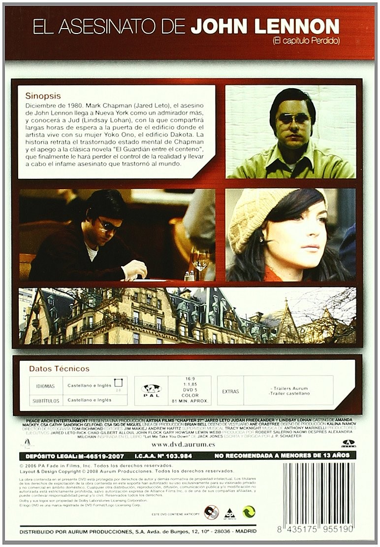 https://back.dvdstorespain.es/en/films/130408-el-asesinato-de-john-lennon-dvd-2013--8435175955190.html130408El Asesinato de John Lennon [DVD] (2007) Chapter 27A finales de septiembre de 1980 Mark Chapman, cuyos transtornos mentales le convierten en una persona absolutamente inestable, llega a Nueva York con la idea de asesinar a John Lennon... "Chapter 27" es un polémico filme, estrenado en Cannes, acusado por fans de The Beatles de ensalzar la figura del asesino de Lennon. https://dvdstorespain.es/1148980-home_default/el-asesinato-de-john-lennon-dvd-2013-.jpg7.2727instock7.27277.2727002026-03-17T16:30:09+0100/Start/Start/DVD/Start/Films/Start/New