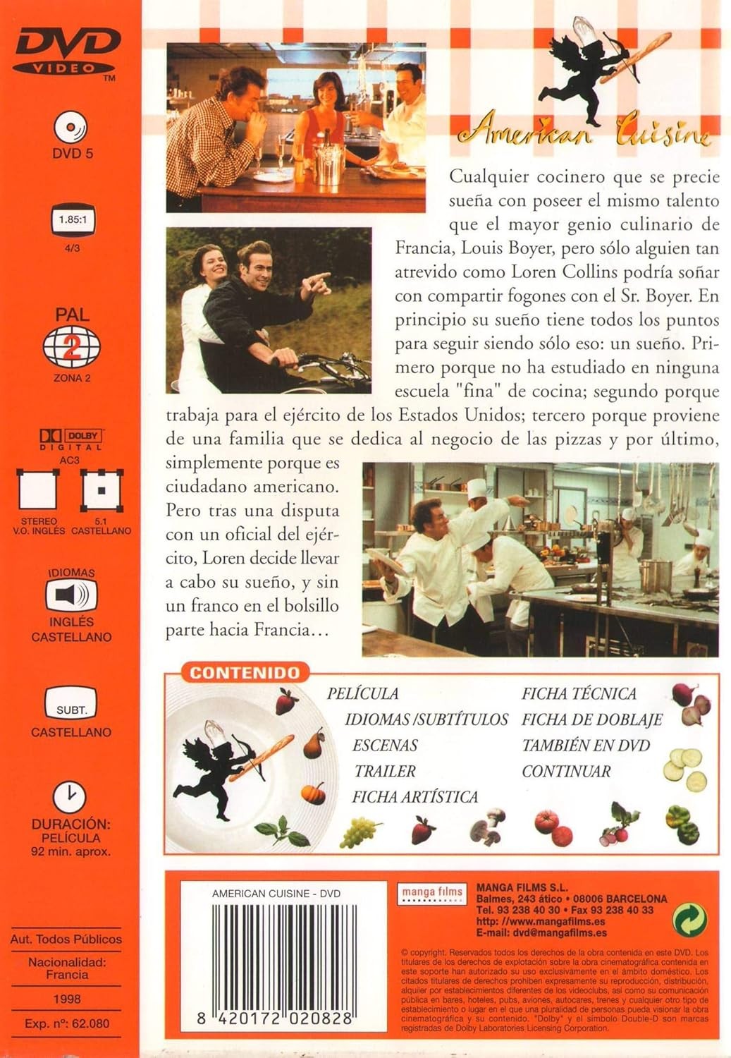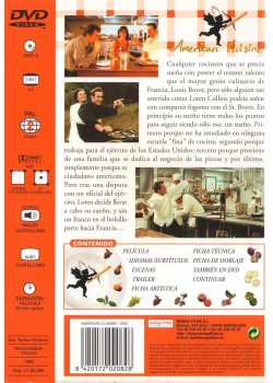 https://back.dvdstorespain.es/en/films/130529-american-cuisine-dvd--8420172020828.html130529American Cuisine [DVD] (1999) Cuisine américaineCualquier cocinero que se precie sueña con igualar el talento del mayor genio culinario de Francia, Louis Boyer, pero sólo alguien tan atrevido como Loren Collins podría albergar el sueño de compartir fogones con él. En principio, las posibilidades de hacerlo realidad parecen nulas: no ha estudiado en una alta escuela de cocina, trabaja para el ejército de los EE.UU., procede de una familia que se dedica al negocio de las pizzas y, por último, es un ciudadano americano. Sin embargo, tras una disputa con un oficial del ejército, Loren, sin un franco en el bolsillo, parte para Francia. https://dvdstorespain.es/1150595-home_default/american-cuisine-dvd-.jpg11.9008instock11.900811.9008002026-03-18T21:15:02+0100/Start/Start/DVD/Start/Films/Start/New