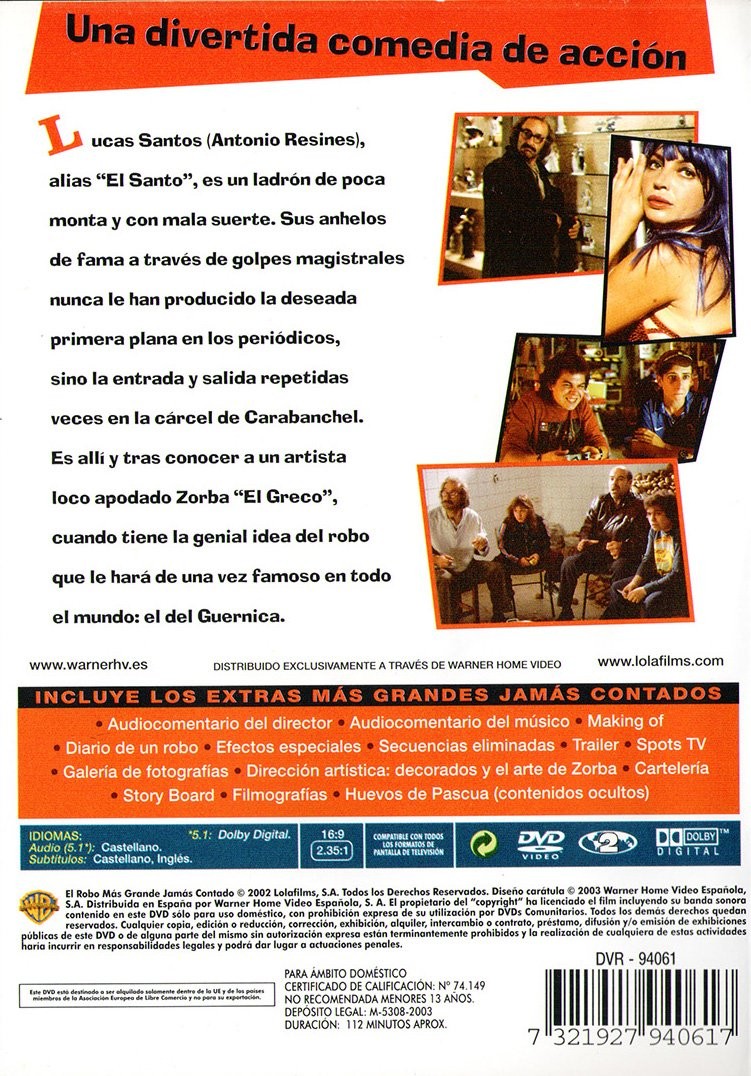 https://back.dvdstorespain.es/en/films/130661-el-robo-mas-grande-jamas-contado-dvd-7321927940617.html130661El Robo Más Grande Jamás Contado [DVD] (2002)Lucas Santos, alias "el Santo" (Antonio Resines), es un ladrón de pacotilla que entra y sale continuamente de la cárcel. Harto de robos chapuceros, sueña con dar un golpe que lo convierta en protagonista de todos los medios de comunicación. Su esposa (Neus Asensi) es una mujer comprensiva y dulce que trabaja como stripper ocasional en un club nocturno. Tras montar una disparatada banda de inexpertos ladrones, Lucas decide robar el cuadro más valioso del Museo Nacional de Arte Reina Sofía: El Guernica de Pablo Picasso. https://dvdstorespain.es/1152395-home_default/el-robo-mas-grande-jamas-contado-dvd.jpg5.9504instock5.95045.9504002026-03-20T02:31:30+0100/Start/Start/DVD/Start/Films/Start/New