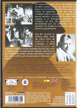 https://back.dvdstorespain.es/en/films/130686-el-hombre-que-sabia-demasiado-dvd--8431804008800.html130686El Hombre que Sabía Demasiado [DVD] (1934) The Man Who Knew Too MuchBob y Jill Lawrence son un matrimonio que está de vacaciones en Suiza con su hija Betty. Allí entablan amistad con Louis Bernard, un francés que recibe un disparo en el corazón mientras baila con Jill. Justo antes de morir, Louis le pide a Bob que entregue a las autoridades unos documentos que tiene escondidos en su habitación. Bob descubre que Bernard era, en realidad, un espía británico que seguía los pasos de una misteriosa organización que planeaba asesinar a un político extranjero en Londres. A continuación Bob recibe la llamada de un desconocido que le exige que abandone el asunto o su hija sufrirá las consecuencias... https://dvdstorespain.es/1152878-home_default/el-hombre-que-sabia-demasiado-dvd-.jpg4.9587instock4.95874.9587002026-03-20T04:30:45+0100/Start/Start/DVD/Start/Films/Start/New