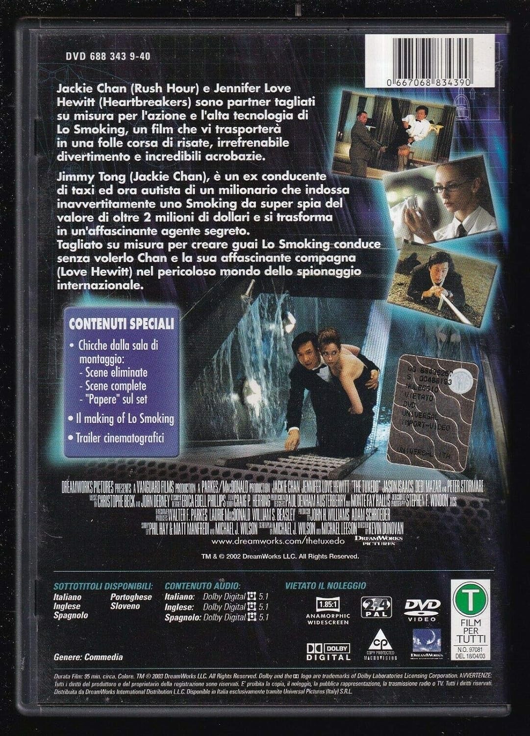 https://back.dvdstorespain.es/en/films/130731-thetuxedo-dvd--0667068834390.html130731Lo Smoking [DVD] (2002) The TuxedoJimmy Tong (Jackie Chan), un taxista que ahora tiene el oficio de chófer, aprende pronto que a la hora de trabajar para el playboy millonario Clark Devlin (Jason Isaacs) sólo existe una regla: jamás se debe tocar el esmoquin, el traje de etiqueta que tanto aprecia Devlin. Pero cuando éste queda temporalmente fuera de combate tras sufrir un explosivo "accidente", Jimmy se pone el esmoquin y descubre que es un traje extraordinario: más que vestirse de color negro, ponérselo equivale a convertirse en cinturón negro. Jimmy se ve bruscamente sumergido en el peligroso mundo del espionaje y en unión con una novata compañera (Jennifer Love Hewitt), tan inexperta como él, nuestro héroe se convierte en un involuntario, si bien muy elegante, agente secreto. https://dvdstorespain.es/1153588-home_default/thetuxedo-dvd-.jpg5.9504instock5.95045.9504002026-03-20T21:16:12+0100/Start/Start/DVD/Start/Films/Start/New