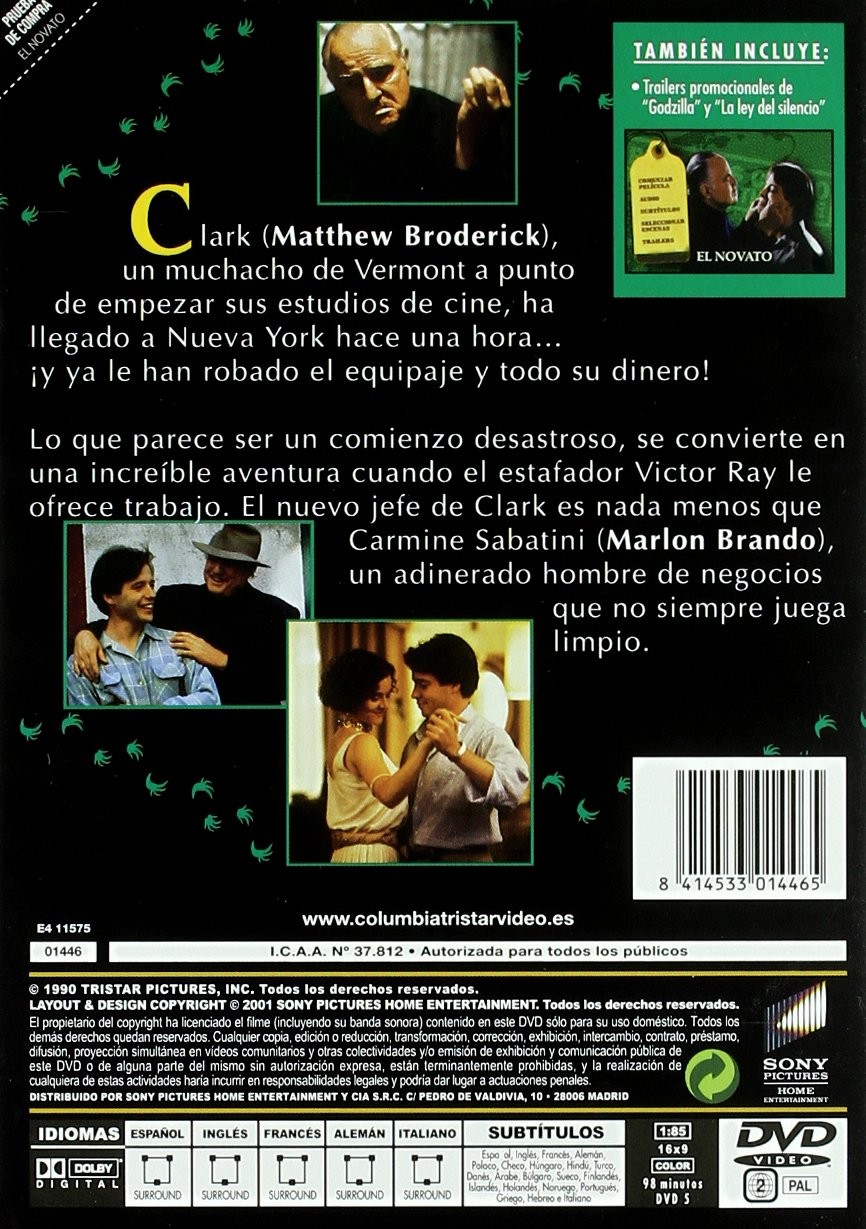 https://back.dvdstorespain.es/en/films/130764-el-novato-dvd--8414533014465.html130764El Novato [DVD] (1990) The FreshmanClark Kellogg (Matthew Broderick) es asaltado momentos después de llegar a Nueva York, así que cuando ve a su atracador varios días después, lo confronta. El hombre promete devolverle lo robado y conseguirle un trabajo con su tío, Carmine Sabatini (Marlon Brando), quien resulta ser un jefe de la mafia. Mientras Clark continúa con su turbio trabajo para Carmine, descubre un inframundo elaborado que ha llamado la atención de las autoridades.https://dvdstorespain.es/1154043-home_default/el-novato-dvd-.jpg8.595instock8.5958.595002026-03-20T22:30:52+0100/Start/Start/DVD/Start/Films/Start/New