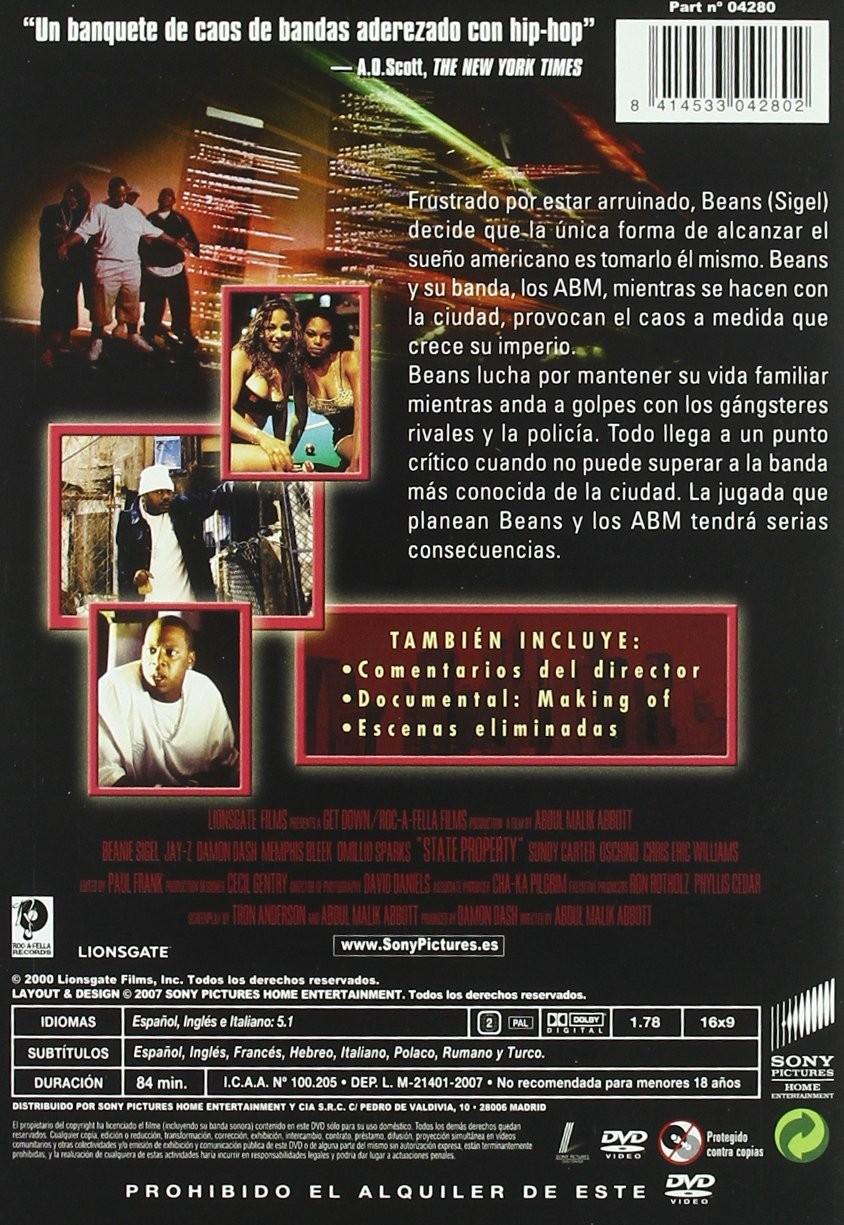 https://back.dvdstorespain.es/en/films/130830-propiedad-estatal-dvd-2015--8414533042802.html130830Propiedad Estatal [DVD] (2002) State PropertyFrustrado por estar arruinado, Beans (Sigel) decide que la única forma de alcanzar el sueño americano es tomarlo él mismo. Beans y su banda, los ABM, mientras se hacen con la ciudad, provocan el caos a medida qeu crece su imperio. Beans lucha por mantener su vida familiar mientras anda a golpes con los gángster rivales y la policía. Todo llega a un punto crítico cuando no puede superar a la banda más conocida de la ciudad. La jugada que planean Beans y los ABM tendrán serias consecuencias. https://dvdstorespain.es/1155253-home_default/propiedad-estatal-dvd-2015-.jpg9.9174instock9.91749.9174002026-03-23T20:30:02+0100/Start/Start/DVD/Start/Films/Start/New