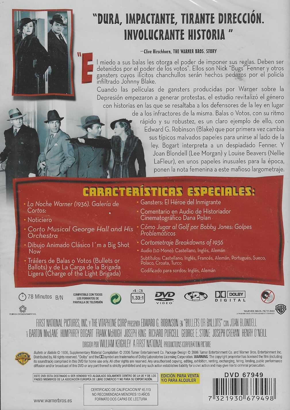 https://back.dvdstorespain.es/en/films/131279-balas-o-votos-dvd-2006--7321930679498.html131279Balas o Votos [DVD] (1936) Bullets or BallotsCon la pandilla de Al Kruger a la cabeza, los gángsters de Nueva York prosperan gracias a una administración débil que ha enviado al duro policía Johnny Blake (Edward G. Robinson) a un barrio de las afueras. Los cerebros de la banda son un triunvirato de banqueros cuyas influencias políticas, financieras y sociales permiten la existencia de los gángsters. Cuando Bryan, un editor que hace campaña contra ellos, aparece asesinado, un gran jurado designa al capitán Dan McLaren para que acabe con los malhechores. McLaren expulsa, aparentemente, a Blake del cuerpo de policía y éste, enfadado, se une a la banda como mano derecha de Kruger. Nick Fenner (Humphrey Bogart), el ayudante y asesino de Bryan, sospecha de Blake y desconfía de la presencia del ex policía en la banda. https://dvdstorespain.es/1162140-home_default/balas-o-votos-dvd-2006-.jpg5.9504instock5.95045.9504002026-03-30T17:16:26+0200/Start/Start/DVD/Start/Films/Start/New