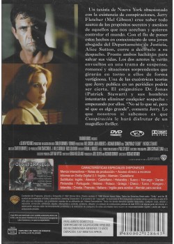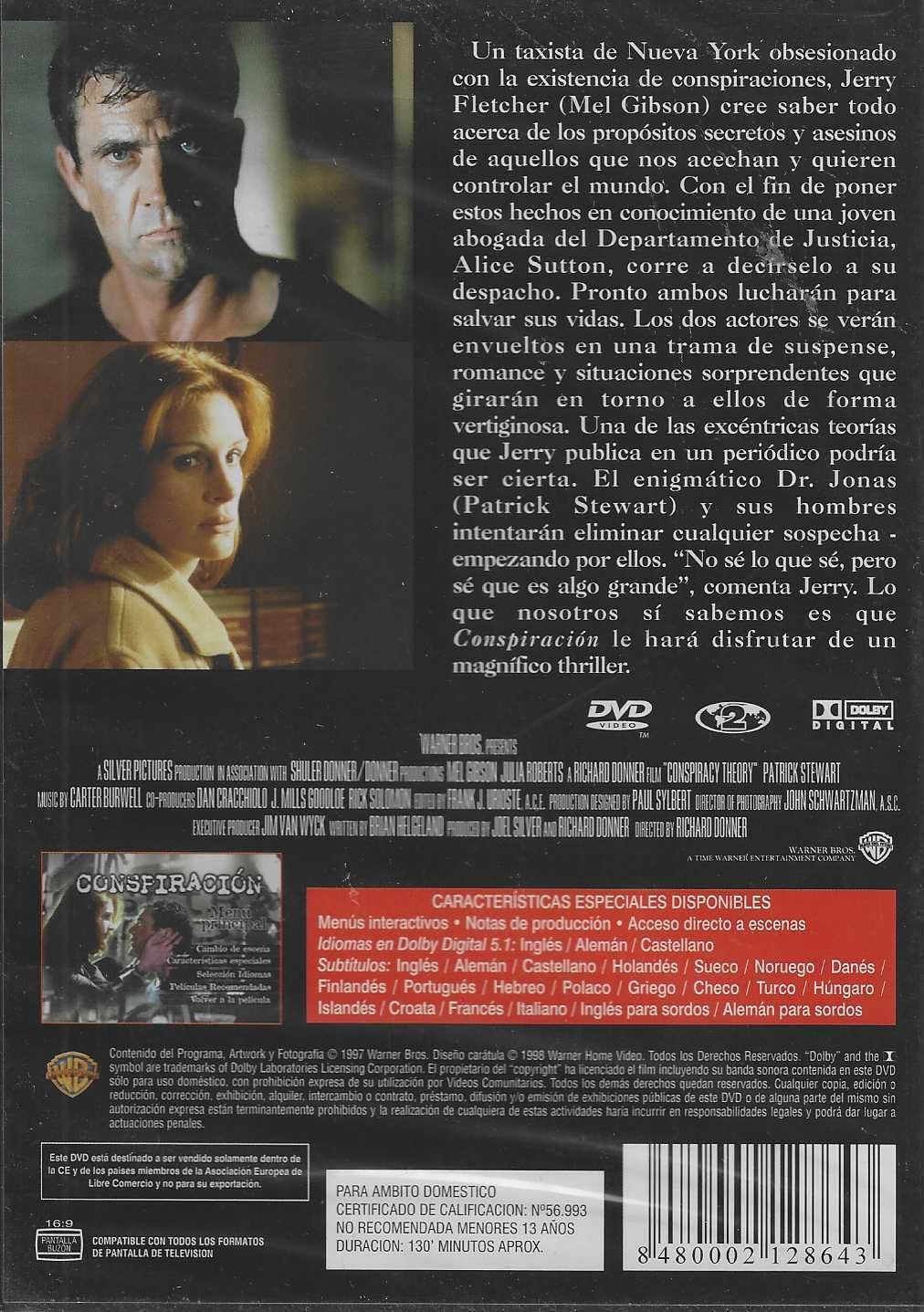 https://back.dvdstorespain.es/en/films/131469-conspiracion-conspiracy-theory-dvd-dvd-2024--0605848269574.html131469Conspiración [DVD] (1997) Conspiracy TheoryJerry Fletcher (Mel Gibson), un excéntrico taxista de Nueva York, está convencido de que el mundo se rige por conspiraciones a gran escala de las que todos somos víctimas, y ése es el principal tema de conversación con sus clientes. Todos lo toman por loco. Jerry les asegura a todos que la NASA está provocando terremotos y que asesinará al Presidente aprovechando su estancia en Turquía. No deja de acosar a Alice (Julia Roberts), la joven ayudante del Fiscal que no sabe cómo quitárselo de encima. Pero, de pronto, los acontecimientos parecen darle la razón: unos hombres que parecen agentes del Gobierno lo secuestran y lo torturan. Tras conseguir escapar, Alice empieza a pensar que, tal vez, Jerry no esté tan loco como todos suponen. https://dvdstorespain.es/1162678-home_default/conspiracion-conspiracy-theory-dvd-dvd-2024-.jpg9.9174instock9.91749.9174002026-03-30T17:51:37+0200/Start/Start/DVD/Start/Films/Start/New