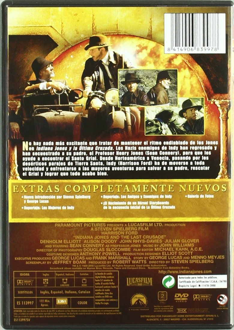 https://back.dvdstorespain.es/en/films/131533-indiana-jones-y-la-ultima-cruzada-dvd-2008--8414906839978.html131533Indiana Jones y la Última Cruzada [DVD] (1989) Indiana Jones and the Last CrusadeEn esta tercera entrega, el padre del protagonista (Harrison Ford), Henry Jones, también arqueólogo (Sean Connery), es secuestrado cuando buscaba el Santo Grial. Indiana tendrá que ir a rescatarlo y, de paso, intentar hacerse con la preciada reliquia, que también ambicionan los nazis. https://dvdstorespain.es/1165887-home_default/indiana-jones-y-la-ultima-cruzada-dvd-2008-.jpg9.2562instock9.25629.2562002026-03-31T21:00:08+0200/Start/Start/DVD/Start/Films/Start/New