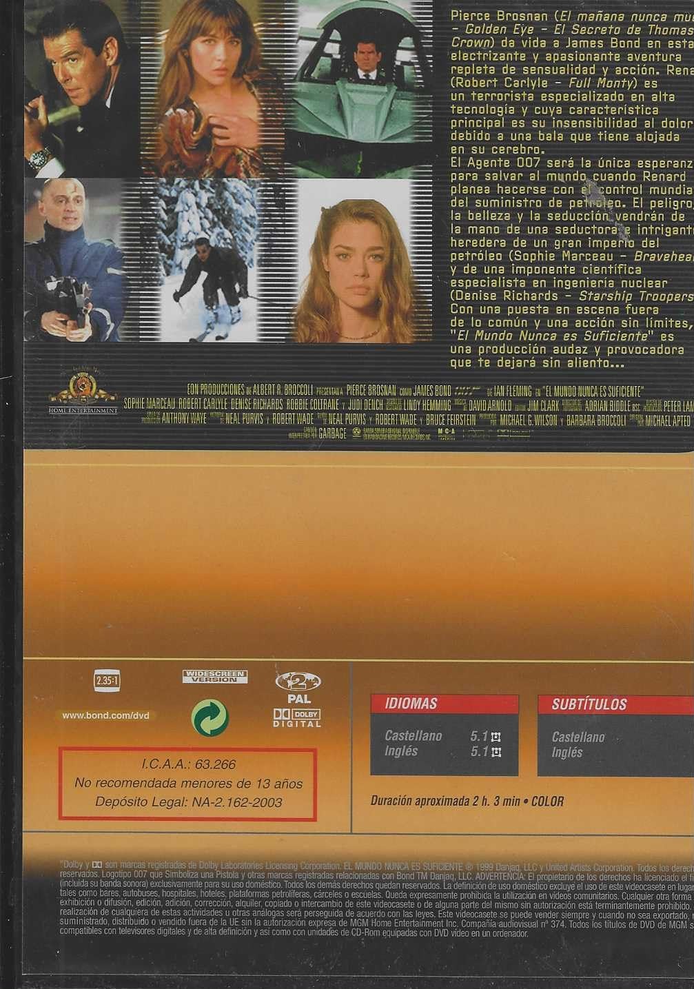 https://back.dvdstorespain.es/en/films/131611-007-el-mundo-nunca-es-suficiente-dvd-dvd-2024--0605848786965.html131611El Mundo Nunca es Suficiente [DVD] (1999) The World Is Not EnoughTras la muerte del magnate británico del petróleo Sir Robert King en un atentado en el cuartel general del MI6, su hija Elektra hereda sus fabulosos yacimientos petrolíferos del mar Caspio. El agente 007, que se siente culpable de la muerte de King, se convierte en el guardaespaldas de Elektra. Su astronómica fortuna atrae no sólo la atención de la prensa internacional, sino también la del asesino, un hombre con una bala alojada en el cerebro que le impide sentir dolor físico y cuya única obsesión es la venganza. https://dvdstorespain.es/1167270-home_default/007-el-mundo-nunca-es-suficiente-dvd-dvd-2024-.jpg7.2727instock7.27277.2727002026-04-02T11:15:02+0200/Start/Start/DVD/Start/Films/Start/New