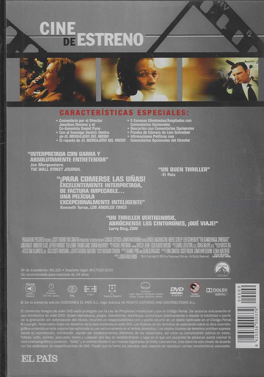 https://back.dvdstorespain.es/en/films/131662-el-mensajero-del-miedo-dvd-coleccian-cine-de-estreno-edician-slim-dvd-2024--0605848380729.html131662El Mensajero del Miedo (Edición Slim) [DVD] (2004) The Manchurian CandidateEn sus conferencias, el comandante Bennett Marco habla constantemente de la emboscada que sufrió su pelotón en el desierto kuwaití y del heroísmo del sargento Raymond Shaw, que recibió la Medalla de Honor por salvar a sus compañeros. Sin embargo, una serie de pesadillas recurrentes le hacen dudar del heroísmo del sargento. Cuando Shaw, empujado por su madre, la polémica senadora Eleanor Prentiss, se presenta como candidato a la vicepresidencia de los EE.UU., las sospechas de Marco crecen. Decide entonces emprender una investigación, llena de obstáculos, para averiguar la verdad antes de que Shaw y su equipo lleguen a la Casa Blanca. https://dvdstorespain.es/1167978-home_default/el-mensajero-del-miedo-dvd-coleccian-cine-de-estreno-edician-slim-dvd-2024-.jpg5.2893instock5.28935.2893002026-04-04T23:16:15+0200/Start/Start/DVD/Start/Films/Start/New