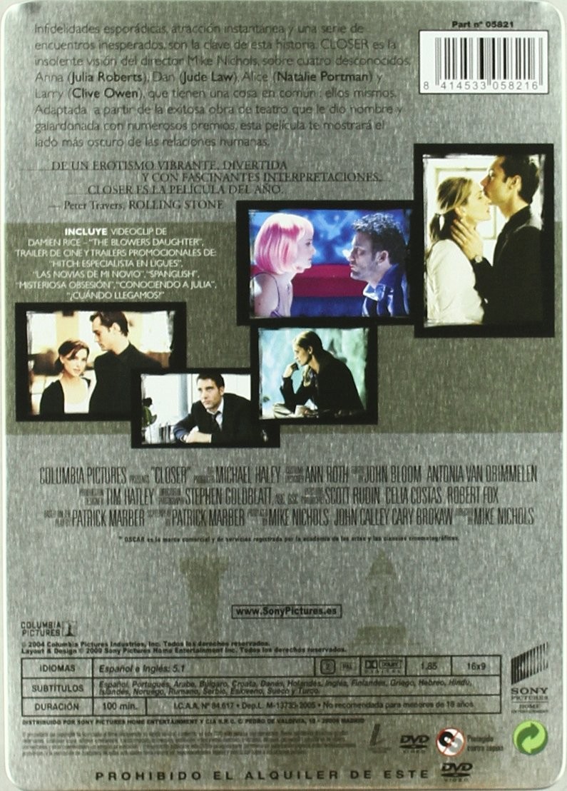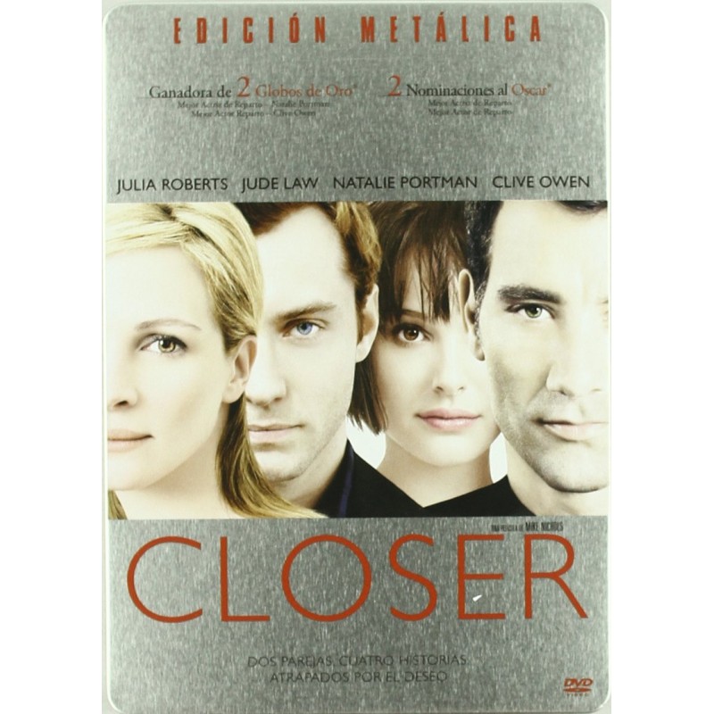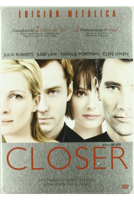 https://back.dvdstorespain.es/en/films/131939-closer-edmetalica-dvd-2009--8414533058216.html131939Closer (Edición metálica) [DVD] (2004)Una historia de pasiones, sexo, amor y abandono que involucra a dos parejas, con una situación que se complica cuando el hombre de la primera pareja conoce a la mujer de la segunda. https://dvdstorespain.es/1172798-home_default/closer-edmetalica-dvd-2009-.jpg9.9174instock9.91749.9174002026-04-15T20:45:02+0200/Start/Start/DVD/Start/Films/Start/New