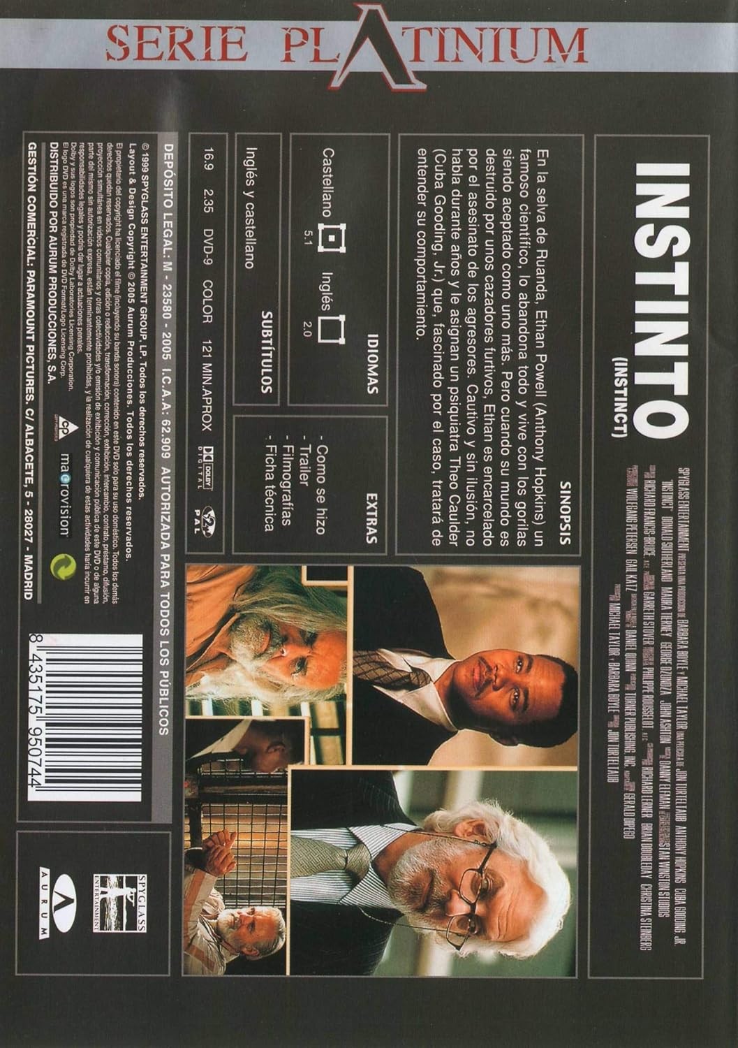 https://back.dvdstorespain.es/en/films/131959-instinto-dvd-2007--8435175950744.html131959Instinto [DVD] (1999) InstinctEl legendario antropólogo Ethan Powell (Hopkins) esconde un gran secreto. Apenas se habla con su familia y ha sido arrestado por unos crímenes en Ruanda. De manera meticulosa, ha estudiado el comportamiento de los gorilas, llegando, incluso, a ser aceptado como uno más de la camada. Ahora vive enmudecido en una prisión para enfermos mentales. Por su parte un ambicioso psiquiatra, Theo Caulder (Cuba Gooding, Jr.), intenta comprender las acciones de este demente acaparador de titulares. Así, ambos hombres se embarcan en un extraordinario viaje, empujados por su insaciable búsqueda de la verdad, independientemente de su coste. https://dvdstorespain.es/1173037-home_default/instinto-dvd-2007-.jpg9.2562instock9.25629.2562002026-04-15T22:30:02+0200/Start/Start/DVD/Start/Films/Start/New