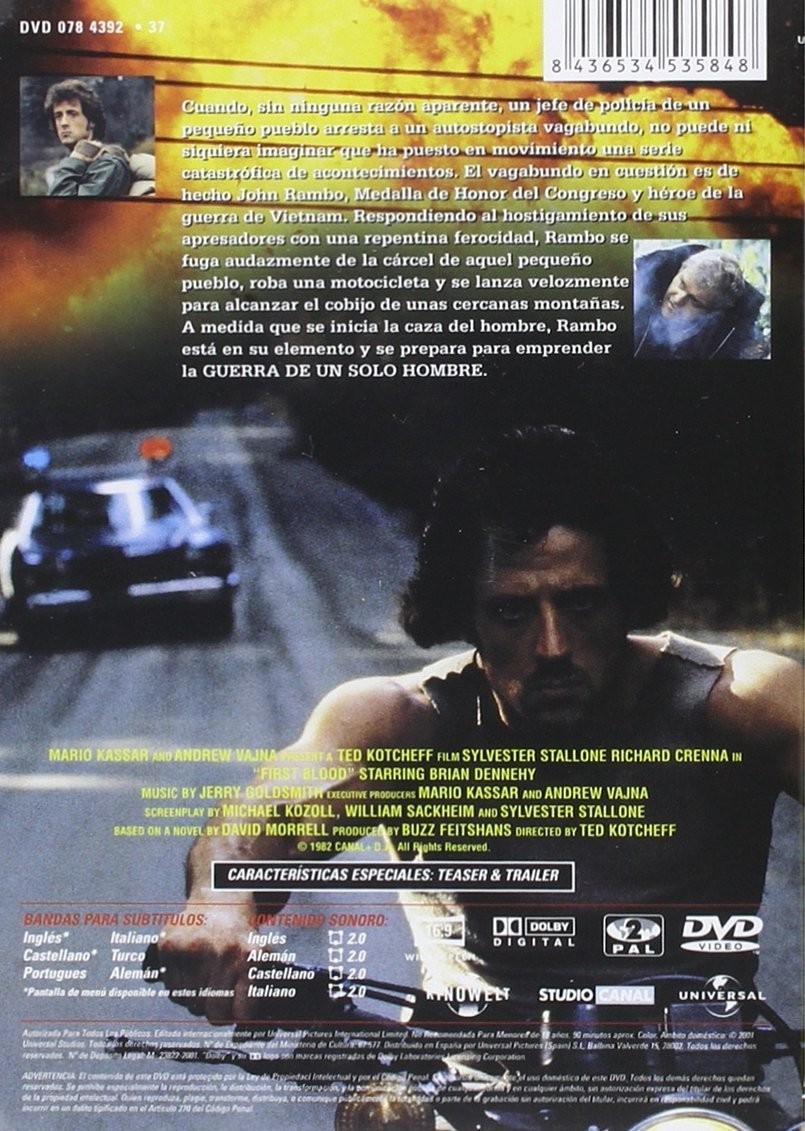 https://back.dvdstorespain.es/en/films/21730-rambo-first-blood-dvd--8436534535848.html21730Rambo: First Blood [DVD]<div id="productDescription" class="a-section a-spacing-small"><br /><p><span>Original title Rambo: First Blood Year 1982 Duration 97 min. Country United States United States Synopsis When John Rambo, a Green Beret veteran, goes to visit an old comrade in arms, he learns that he has died as a victim of the aftermath of the war. A few days later, the police arrest him for being a vagrant and attack him. Then he remembers the torture he suffered in Vietnam and reacts violently.</span></p></div>https://dvdstorespain.es/675077-home_default/rambo-first-blood-dvd-.jpg5.2893instock5.28935.2893002015-11-23T23:41:52+0100/Start/Start/DVD/Start/Films/Start/New