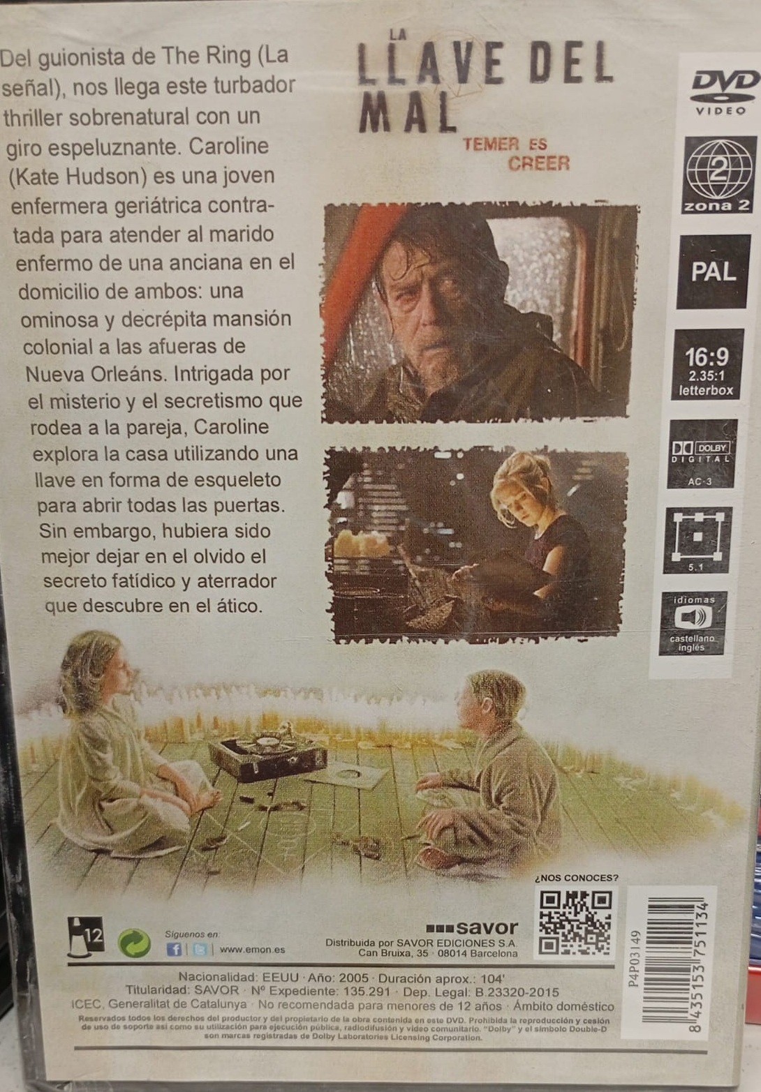 https://back.dvdstorespain.es/en/films/33655-the-skeleton-key-dvd--8435153751134.html33655La Llave del Mal [DVD] (2005) The Skeleton KeyDespués de abandonar su trabajo de enfermera en una clínica, Caroline (Hudson) es contratada para cuidar a un anciano que ha sufrido una embolia, aunque la esposa de éste (Rowlands) la acoge con bastante recelo. El matrimonio vive en una siniestra mansión sureña en las afueras de Nueva Orleáns, en el delta del Mississippi (Louisiana). Intrigada por las extrañas costumbres de la enigmática pareja, Caroline decide explorar la casa. Armada con una llave maestra, empieza a abrir todas las puertas hasta que descubre un desván que encierra un terrible secreto.https://dvdstorespain.es/555925-home_default/the-skeleton-key-dvd-.jpg5.1694instockDEAPLANETA5.16945.1694002016-11-21T08:08:12+0100/Start/Start/DVD/Start/Films/Start/New/Start/EVENING SP 70/Start/VELADA DE 80/Start/VELADA FR 80/Start/VELADA IT 80