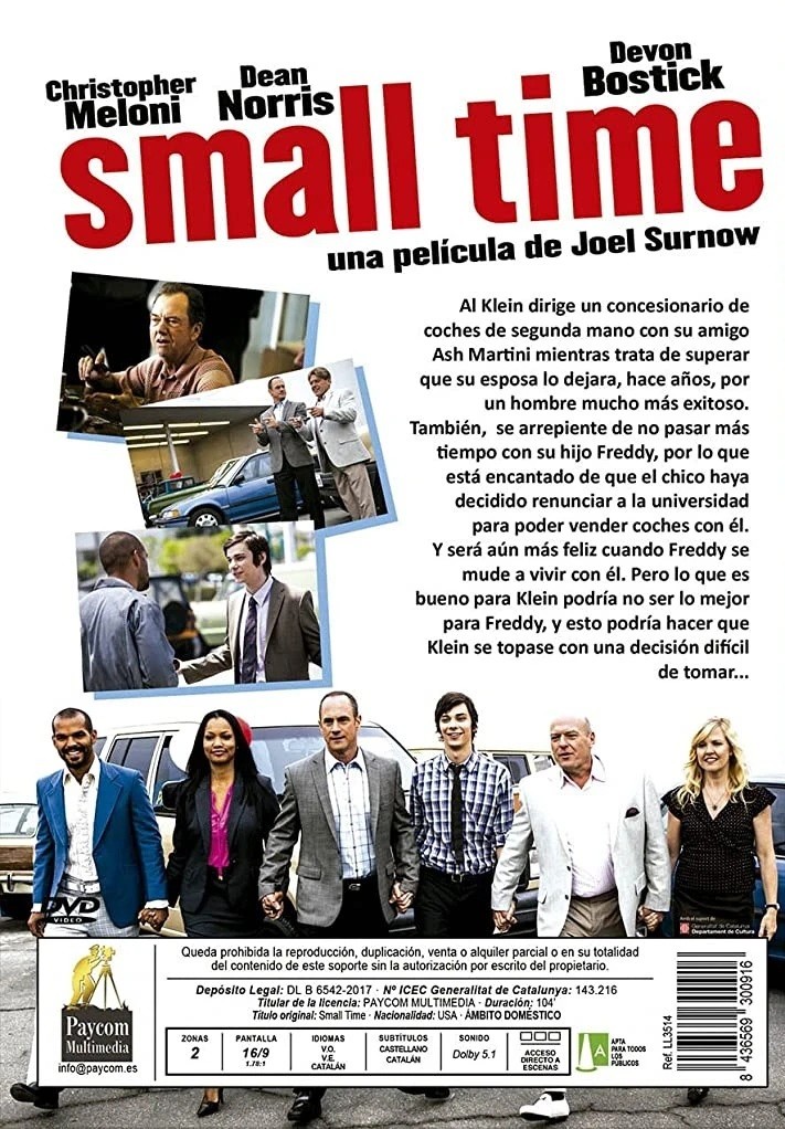 https://back.dvdstorespain.es/en/films/35997-small-dvd--8436569300916.html35997Small Time [DVD] (2013)Al (Christopher Meloni), un vendedor de coches antiguos de Los Ángeles tiene que vivir con el recuerdo de los buenos momentos pasados junto a su ex mujer (Bridget Moynahan), lamentándose por su abandono. A su vez, debe de encauzar la vida de su hijo Freddy (Devon Bostick). Este siempre le ha tomado como un modelo a seguir y quiere continuar con el negocio familiar, pero Al sabe que realmente lo que le conviene y debe hacer es ir a la universidad, por lo que tratará de convencerlo argumentándole que es lo mejor para su futuro. Una difícil tarea teniendo en cuenta que Freddy es un testarudo, no entra en razón y se niega a abandonar el hogar familiar.https://dvdstorespain.es/518306-home_default/small-dvd-.jpg3.2231instockLlamentol3.22313.2231002017-08-01T21:40:55+0200/Start/Start/DVD/Start/Films/Start/New