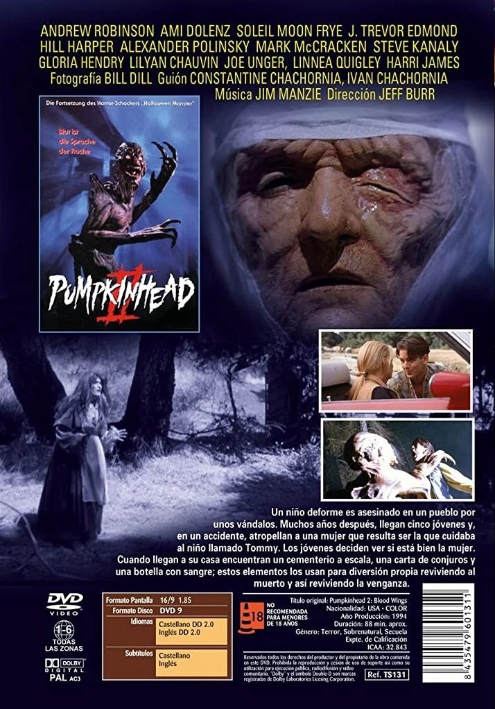https://back.dvdstorespain.es/en/films/39274-pumpkinhead-ii-blood-wings-dvd--8435479601311.html39274Pacto de Sangre 2 - la Maldición de la Bruja [DVD] (1992) Pumpkinhead Ii: Blood WingsUn niño deforme es asesinado en un pueblo por unos vándalos. Muchos años después, llegan cinco jóvenes y, en un accidente, atropellan a una mujer que resulta ser la que cuidaba al niño llamado Tommy. Los jóvenes deciden ver si está bien la mujer. Cuando llegan a su casa encuentran un cementerio a escala, una carta de conjuros y una botella con sangre, estos elementos los usan para diversión propia reviviendo al muerto y así reviviendo la venganza.https://dvdstorespain.es/512999-home_default/pumpkinhead-ii-blood-wings-dvd-.jpg4.876instockVértice Cine4.8764.876002018-03-07T11:59:55+0100/Start/Start/DVD/Start/Films/Start/New/Start/18 YEARS YES D&O