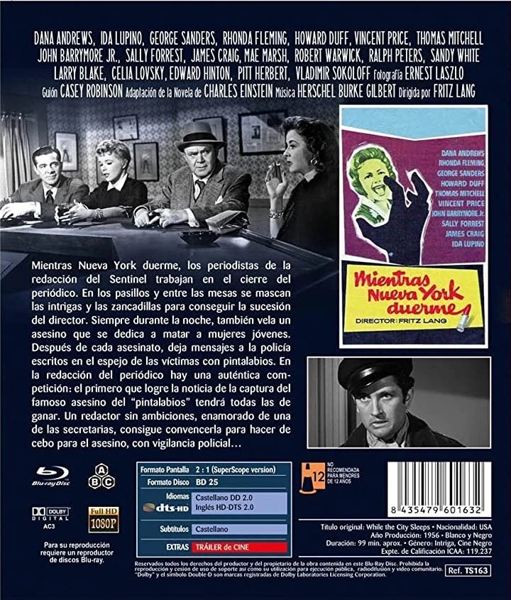 https://back.dvdstorespain.es/en/films/41232-while-the-city-sleeps-bluray--8435479601632.html41232Mientras Nueva York Duerme [Blu-ray] (1956) While the City SleepsLos periodistas del Sentinel están a punto terminar la edición del periódico. En los pasillos y en las mesas se conspira y se intriga para hacerse con la dirección del diario. Mientras tanto, un criminal que se dedica a matar mujeres jóvenes, tras cada asesinato, deja a la policía un mensaje escrito con pintalabios. En el periódico se establece una feroz competición: el primero que consiga la noticia de la captura del asesino "del pintalabios", tendrá todas las de ganar. Un redactor sin ambiciones consigue convencer a una secretaria de la que está enamorado para que sirva de cebo a fin de atraer al asesino, contando, por supuesto, con vigilancia policial.https://dvdstorespain.es/506623-home_default/while-the-city-sleeps-bluray-.jpg7.438instockVértice Cine7.4387.438002018-05-02T13:48:55+0200/Start/Start/Blu-Ray/Start/Films/Start/New/Start/EVENING SP 40/Start/VELADA DE 60/Start/VELADA FR 60/Start/VELADA IT 60