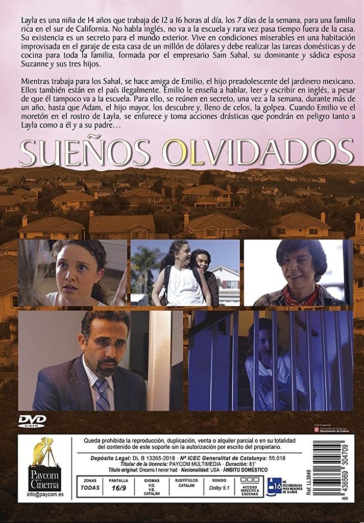 https://back.dvdstorespain.es/en/films/41802-dreams-i-never-had-dvd--8436569304709.html41802Sueños Olvidados [DVD] (0) Dreams I Never HadUna adolescente, Layla, está cautiva en el hogar de una familia adinerada del sur de California, trabajando de 12 a 16 horas cada día de la semana. En la casa se hace amiga de Emilio, hijo del jardinero mexicano, que también está de forma ilegal en el país. Su amistad los lleva a ambos a través de sus vidas sin esperanza y secuestradas a tomar acciones drásticas que podrán en peligro tanto a Layla como a él y a su padre.https://dvdstorespain.es/502885-home_default/dreams-i-never-had-dvd-.jpg3.1017instockLlamentol5.16943.101739.9988393237132.06782018-05-28T19:49:22+0200/Start/Start/DVD/Start/Films/Start/New/Start/EVENING SP 70/Start/VELADA DE 80/Start/VELADA FR 80/Start/VELADA IT 80/Start/APRIL sales/-40%/Start/OFFERS AT €1.95 (buying 5 or more)/Start/APRIL sales