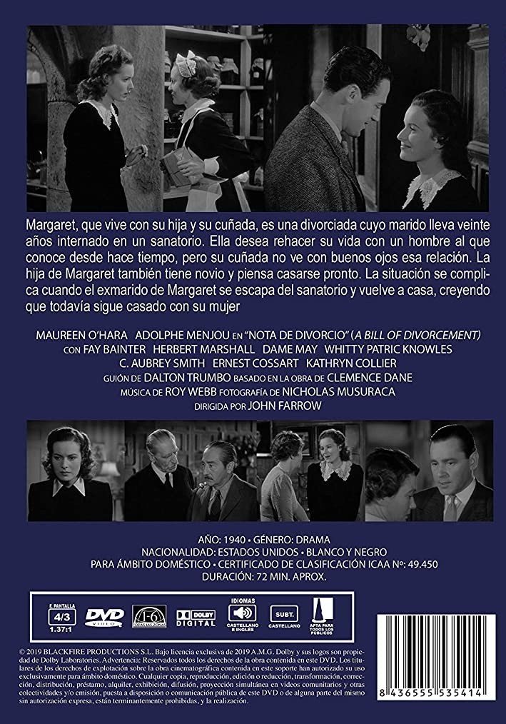 https://back.dvdstorespain.es/en/films/51139-bill-of-divorcement-dvd--8436555535414.html51139Nota de Divorcio [DVD] (1940) a Bill of DivorcementMargaret, que vive con su hija y su cuñada, es una divorciada cuyo marido lleva veinte años internado en un sanatorio. Ella desea rehacer su vida con un hombre al que conoce desde hace tiempo, pero su cuñada no ve con buenos ojos esa relación. La hija de Margaret también tiene novio y piensa casarse pronto. La situación se complica cuando el exmarido de Margaret se escapa del sanatorio y vuelve a casa, creyendo que todavía sigue casado con su mujer.https://dvdstorespain.es/1119396-home_default/bill-of-divorcement-dvd-.jpg7.3554instockResearch Entertainment7.35547.3554002019-09-02T02:30:36+0200/Start/Start/DVD/Start/Films/Start/New/Start/EVENING SP 20/Start/VELADA DE 40/Start/VELADA FR 40/Start/VELADA IT 40